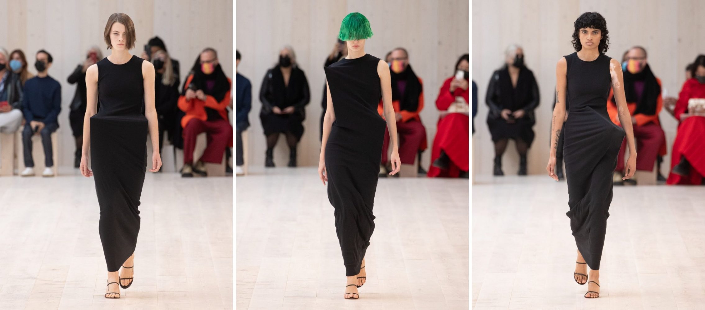 Ba mẫu đầm đen mở màn show diễn. Tối giản. Nhưng mỗi chiếc đầm đều có khung kim loại ẩn bên dưới. Do đó, chúng mang phom dáng dạng khối 3D, khác nhau ở các phần bụng, vai và hông. Phom dáng kỳ lạ này tiếp tục được trình làng xuyên suốt bộ sưu tập, khiến nó khác hẳn những bộ sưu tập khác mùa Xuân Hè năm nay.