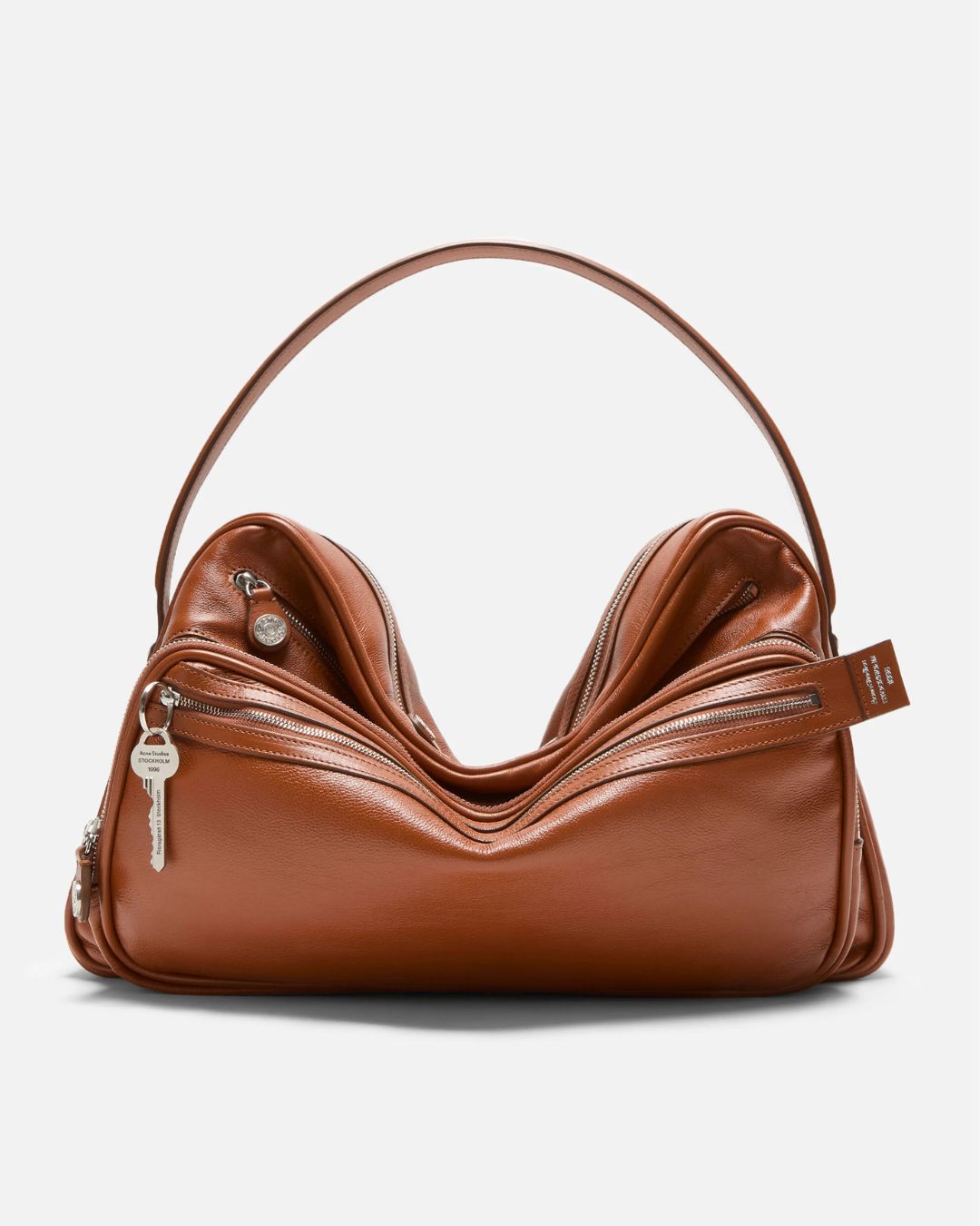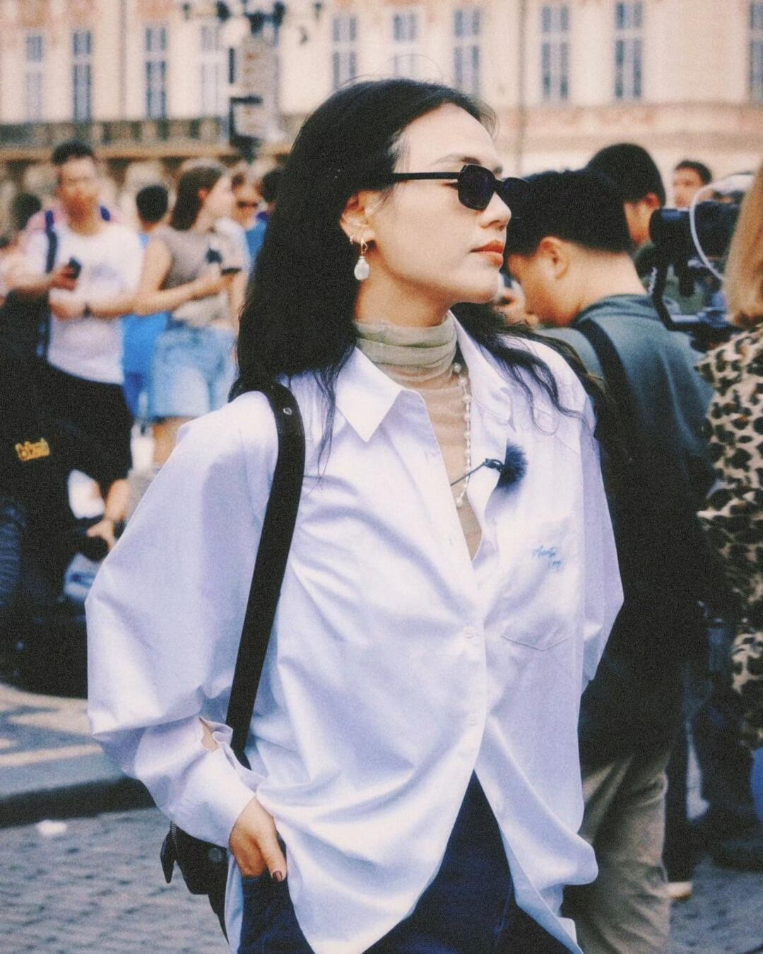 Đến với Parague, Mã Tư Thuần chuyển mình sang hình ảnh thanh lịch, casual chic với áo sơ mi trắng dáng rộng, kết hợp cùng quần jeans ống thụng và điểm nhấn là túi Camero màu nâu cognac của Acne Studios. Túi Camero có thiết kế nhiều ngăn với kiểu dáng hình chữ nhật mềm mại và phom dáng nhỏ gọn và được nhấn nhá bằng các ngăn khóa kéo, móc khóa gắn logo thương hiệu và chi tiết nút logo phong cách denim đặc trưng.
