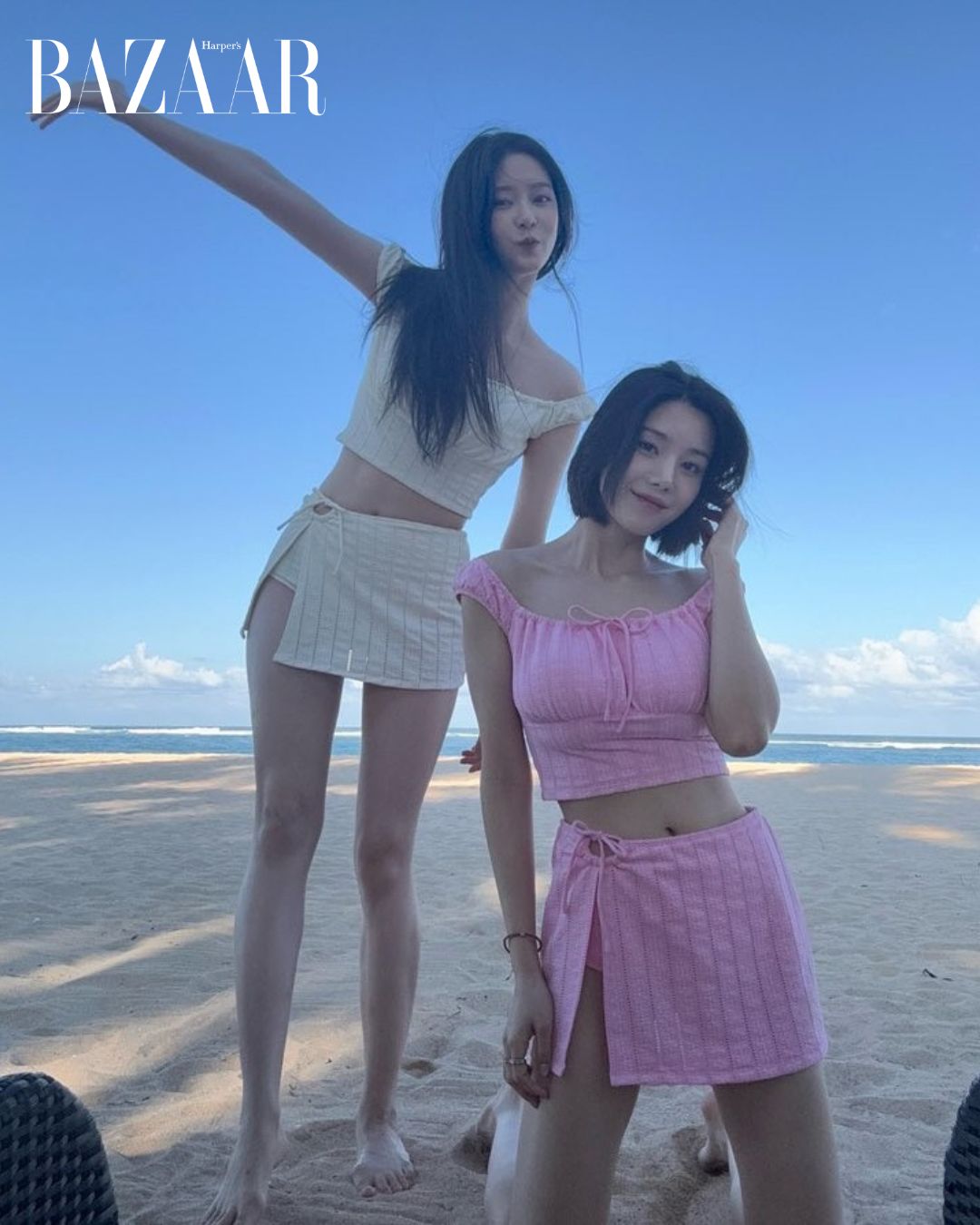 Ngôi sao Hàn Quốc này thường diện các set áo tắm hai mảnh đi kèm với áo khoác cardigan và váy quấn đồng màu. Không chỉ giúp tổng thể trở nên hài hòa, những set đồ như vậy còn giúp tiết kiệm thời gian và đảm bảo bạn luôn xuất hiện với vẻ ngoài chỉn chu mà không cần mang theo quá nhiều món riêng lẻ.