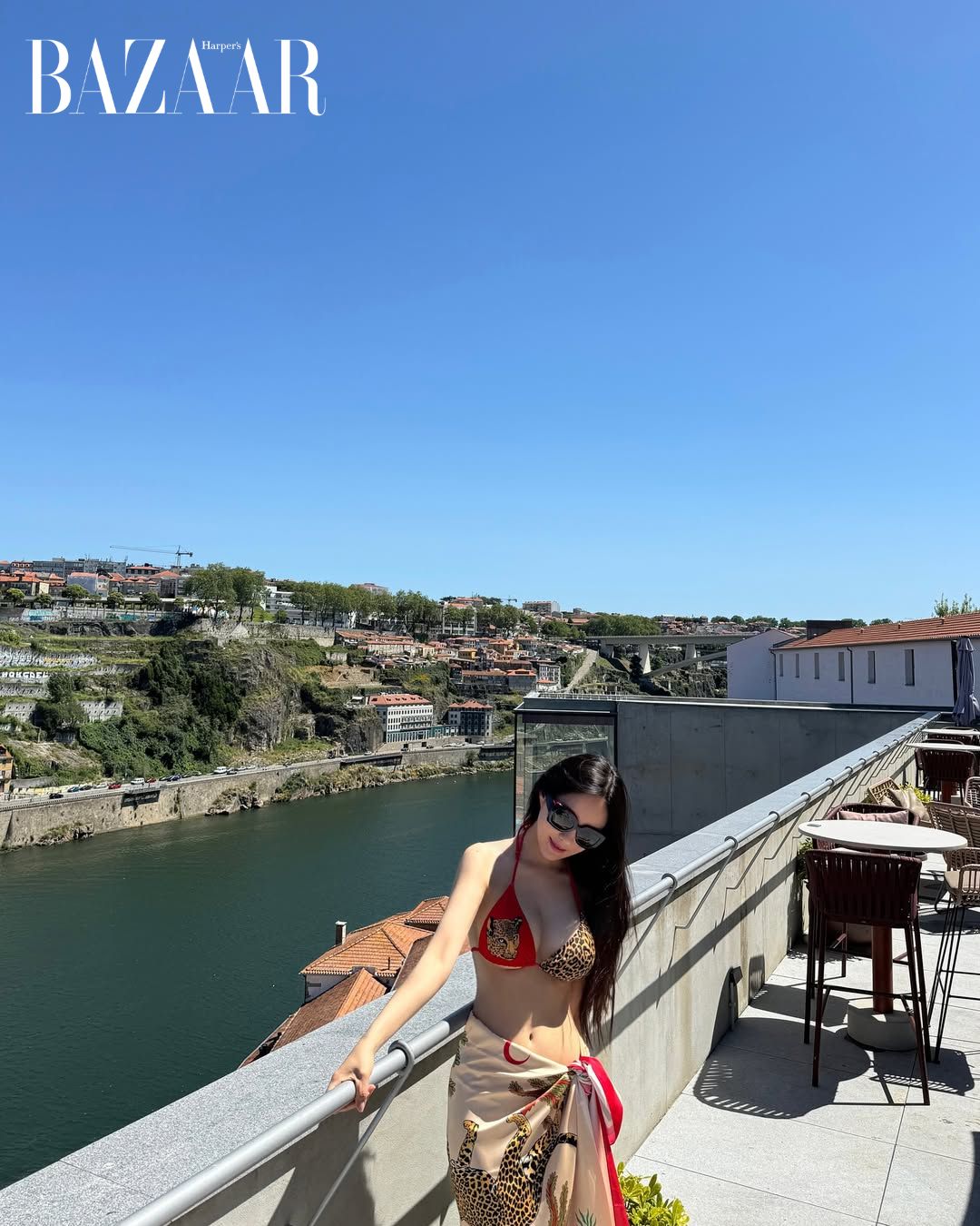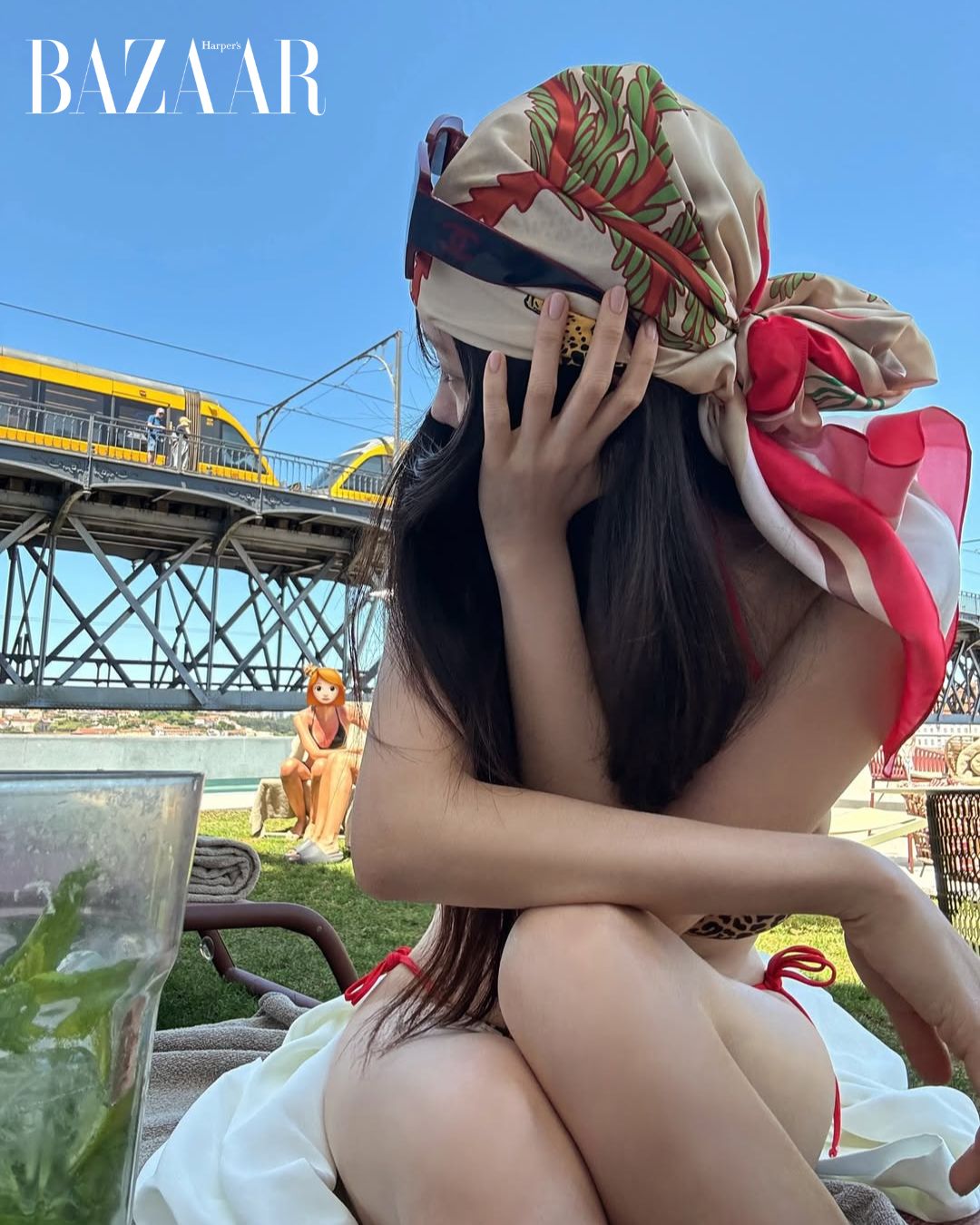 Một trong những món đồ không thể thiếu của Hyomin trong những chuyến du lịch hè 2025 là chiếc khăn lụa bản lớn. Cô thường dùng khăn như một lớp váy quấn, tiện lợi khi cần che chắn lúc di chuyển giữa hồ bơi và nơi ở. Ngoài ra, khăn còn được tận dụng như phụ kiện đội đầu, tạo điểm nhấn duyên dáng cho bộ đồ bơi và đồng thời giúp bảo vệ da đầu khỏi ánh nắng trực tiếp từ mặt trời.