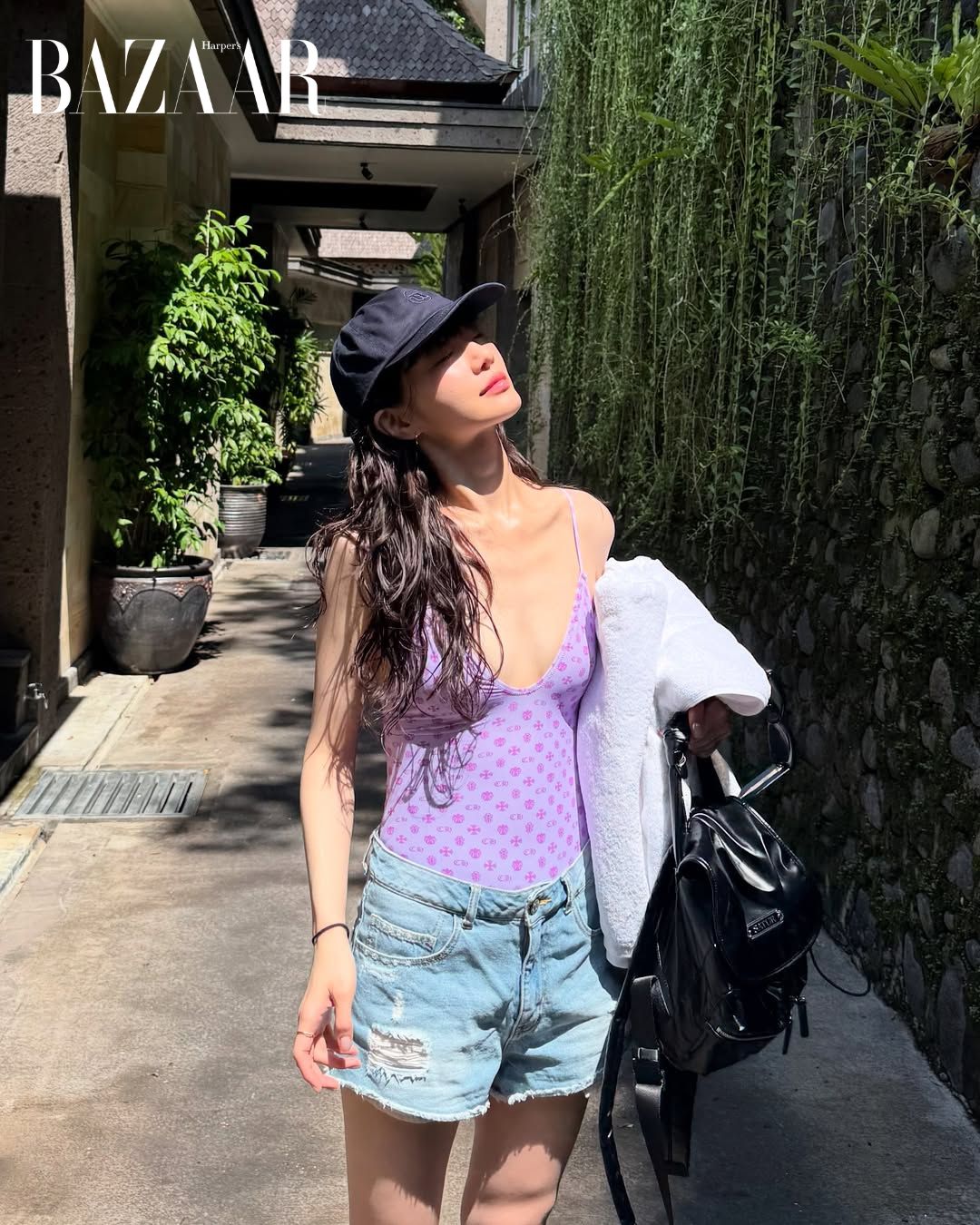 Thay vì mua bikini tam giác truyền thống, sao Hàn này ưu ái các mẫu áo tắm một mảnh giống bodysuit, áo hai dây dáng croptop hoặc áo dạng yếm. Những kiểu áo này vẫn có chất liệu của đồ bơi nhưng lại được thiết kế theo kiểu trang phục xuống phố, dễ dàng phối cùng quần short hoặc quần jeans, sẵn sàng cho một buổi dạo phố sau khi rời bãi biển.