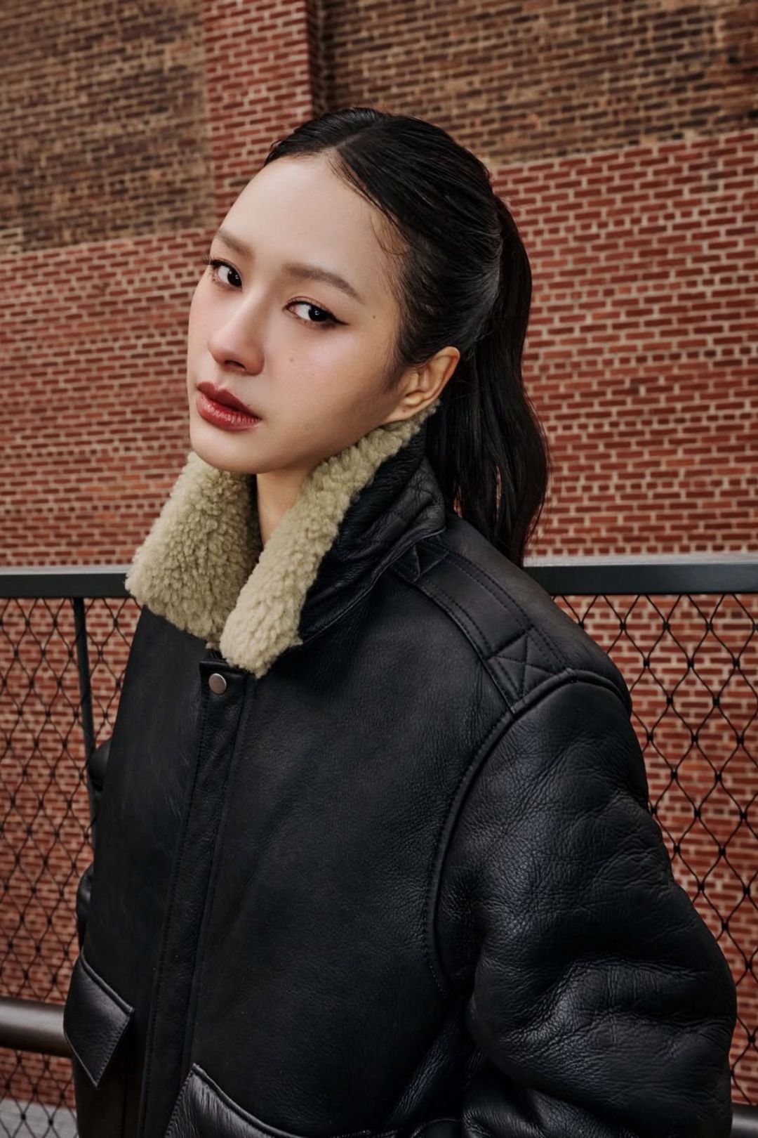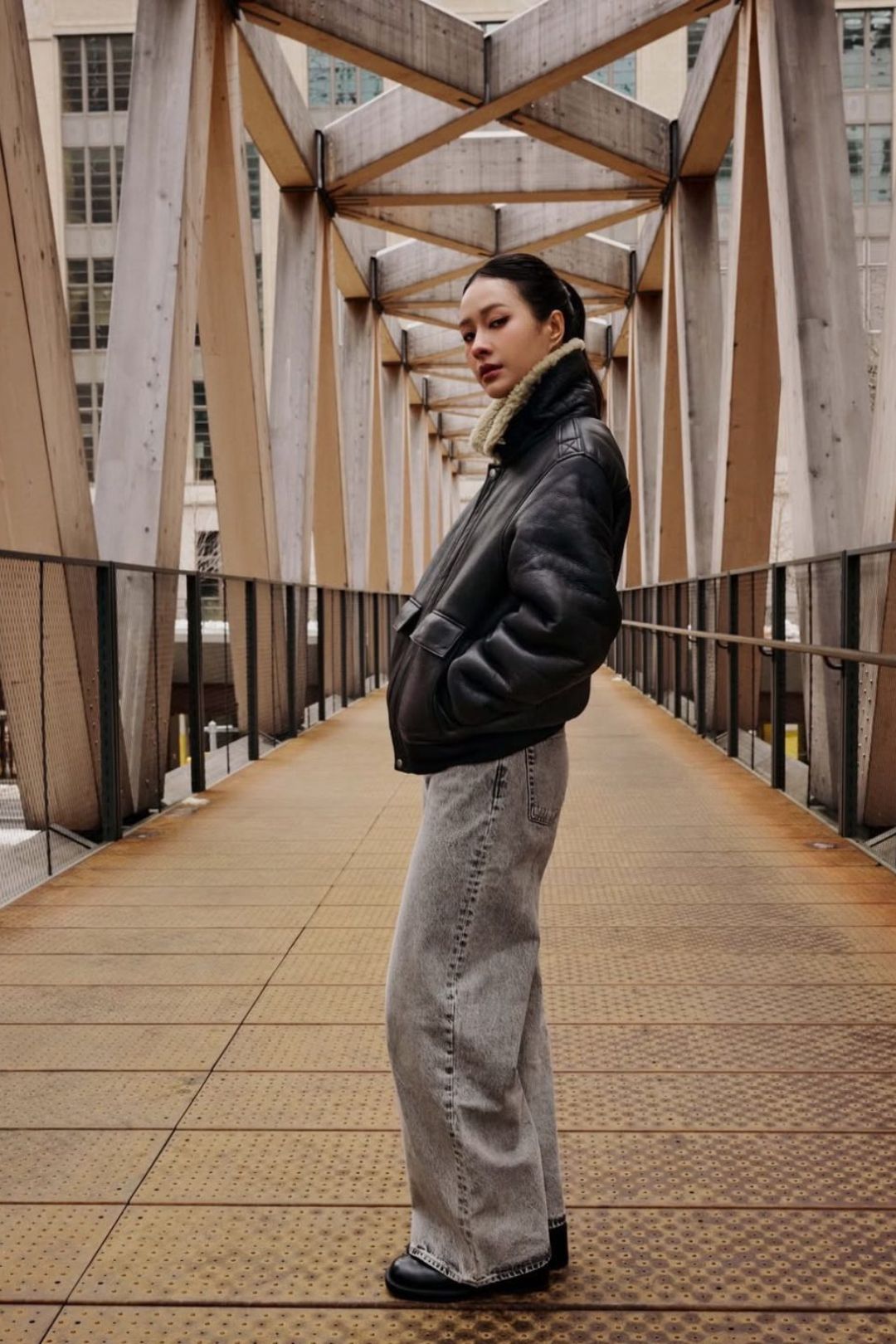 Thiết kế mà Milk Pansa mặc mô phỏng gần như hoàn hảo thiết kế nguyên bản dành cho giới phi công, mang đến vẻ cứng cáp và quyền lực cho cô. Nữ diễn viên chọn giày cũng bằng da thuộc đen, ton-sur-ton với chiếc áo. Kết hợp với quần jeans xám và áo thun trắng, bản phối đơn sắc cực cool khi đứng giữa khung cảnh mang tinh thần công nghiệp của New York.