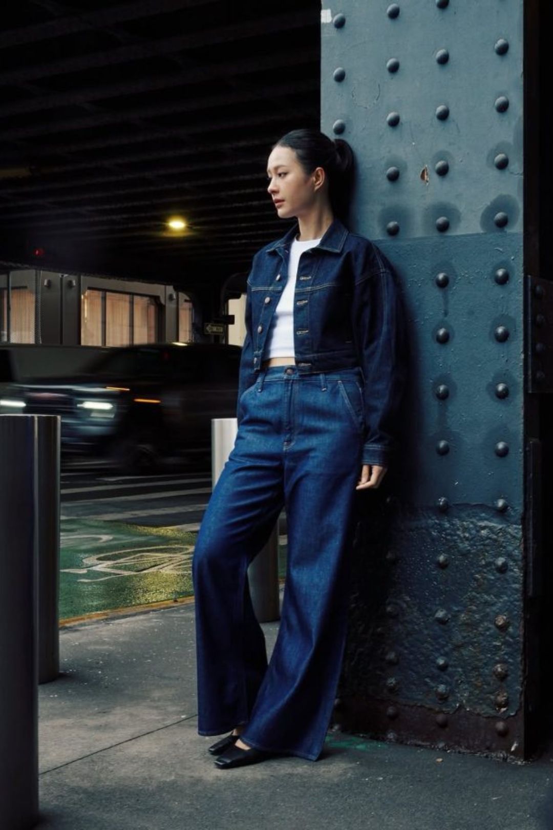 Lối phối đồ theo phong cách denim-on-denim luôn khỏe khoắn và mạnh mẽ. Mang tinh thần thập niên 1990, thập niên huy hoàng của Calvin Klein, bản phối của Milk Pansa kết hợp trang phục denim cùng áo baby tee màu trắng, khai thác triệt để sự tương phản giữa chất liệu denim thô ráp và vẻ mềm mại của chiếc áo thun ôm sát. Cuối cùng, cô làm mềm đi sự gai góc này với đôi giày da thuộc.