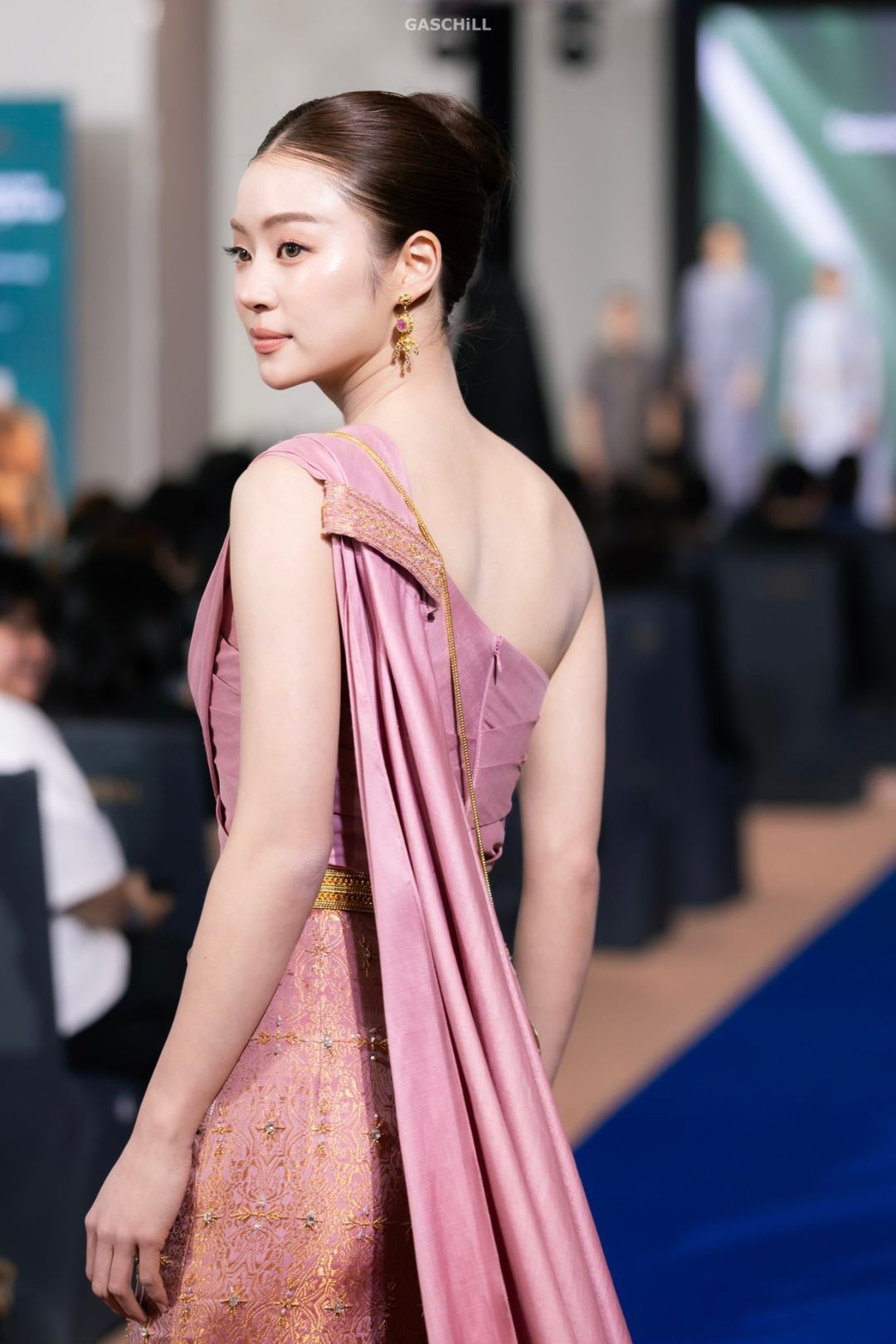 Cách trang điểm của Miu cũng được tiết chế tối đa để nhường chỗ cho vẻ đẹp tự nhiên. Lớp nền mỏng nhẹ như sương, đôi mày ngài thanh tú và sắc son hồng nude nhẹ nhàng đã tạo nên một tổng thể hài hòa tuyệt đối. Kết hợp cùng kiểu tóc búi cao gọn gàng theo truyền thống Thái Lan tạo cảm giác quý phái và không thêm bất cứ loại trâm cài hay kẹp tóc nào. Mái tóc búi cao đã tôn lên phần trán cao, chiếc cổ thanh mảnh cùng bờ vai “mắc áo” của Miu.