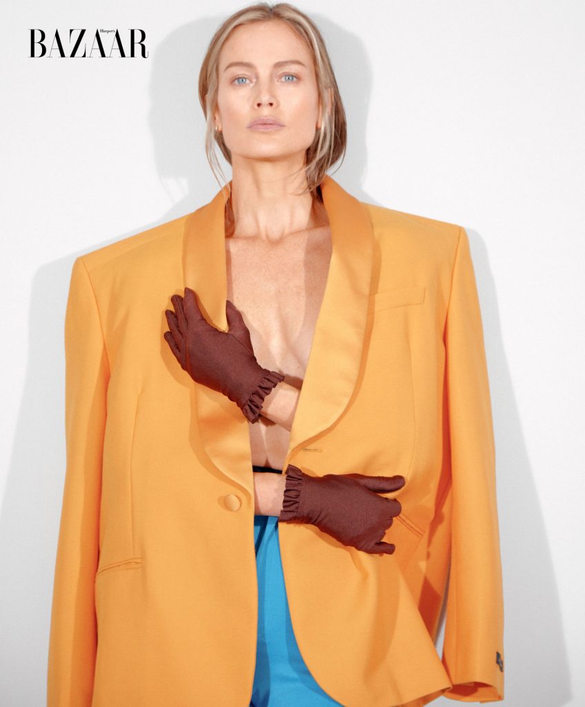 Shouldering Dimension. Carolyn Murphy trong trang phục và phụ kiện của Balenciaga; Estée Lauder Double Wear Nude Cushion Stick Radiant Makeup, $40, esteelauder.com.