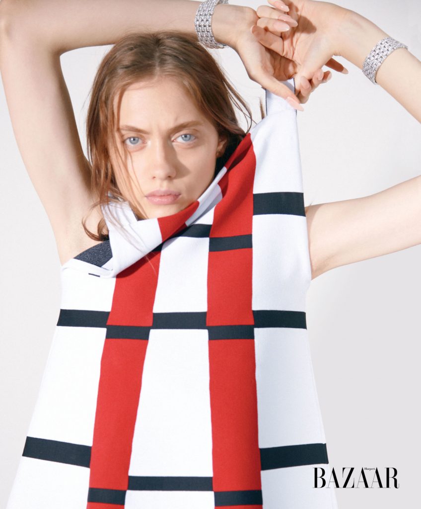 Graphic Attitude. Odette Pavlova diện áo và chân váy Azzedine Alaia ; vòng tay Cartier ; Exuviance Body Tone Firming Concentrate, $57, ulta.com.