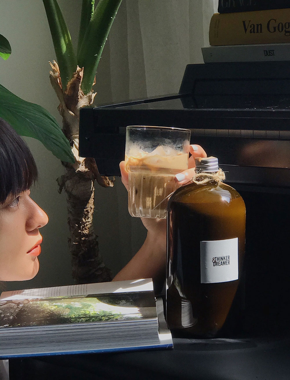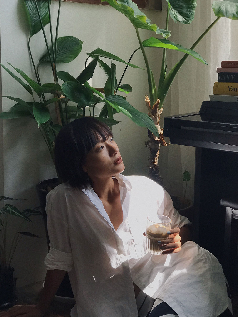 Cho dù có làm điều gì bình thường nhất, Hồ Thu Anh và Thiên Minh cũng có thể biến nó thành một khoảnh khắc nghệ thuật. Ăn mận, uống café, đọc sách, đạp xe hay đi thang máy… tất cả hoạt động ngày thường này đều trông thêm nghệ thuật khi được chụp qua lăng kính trắng-đen kiểu ảnh phim.