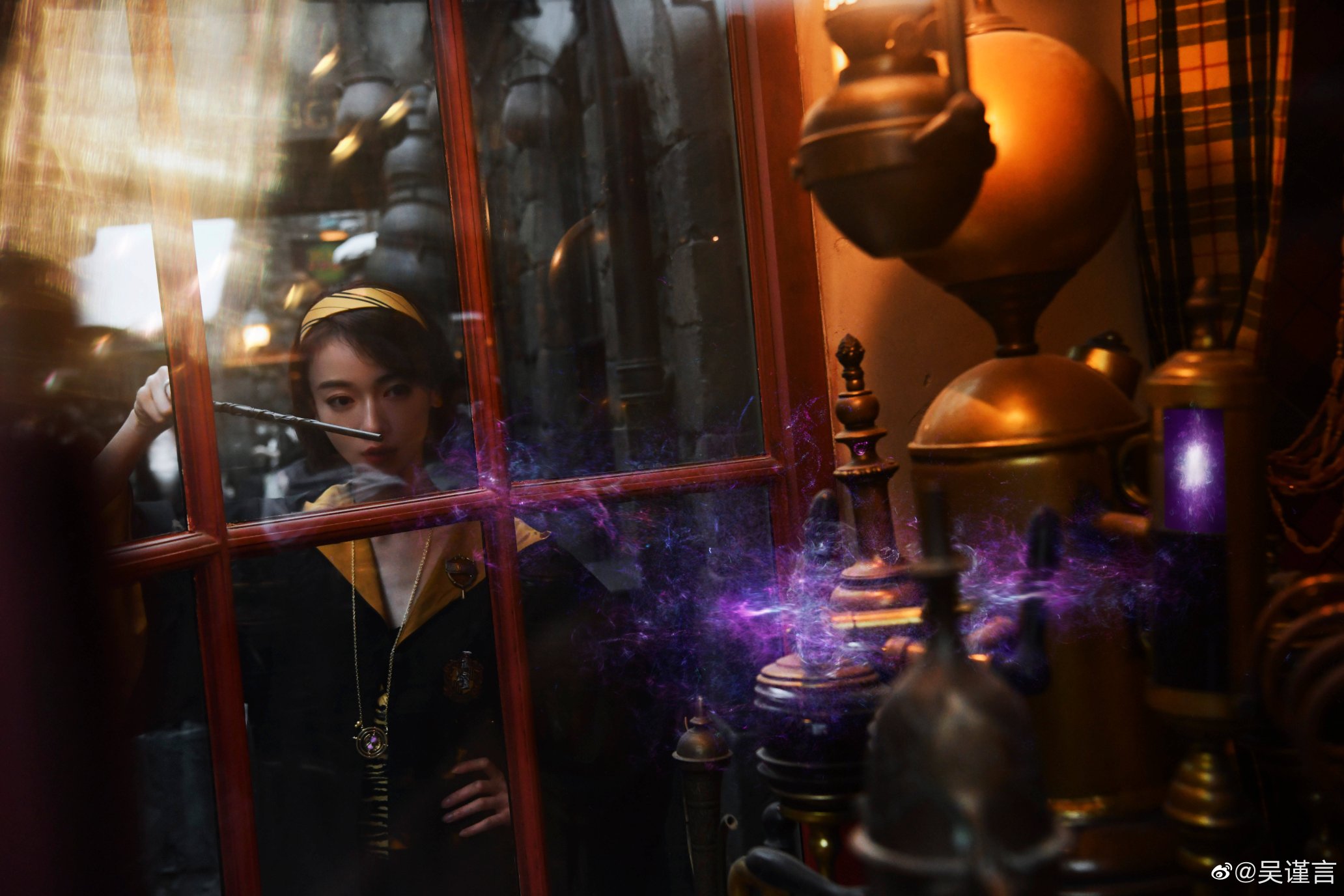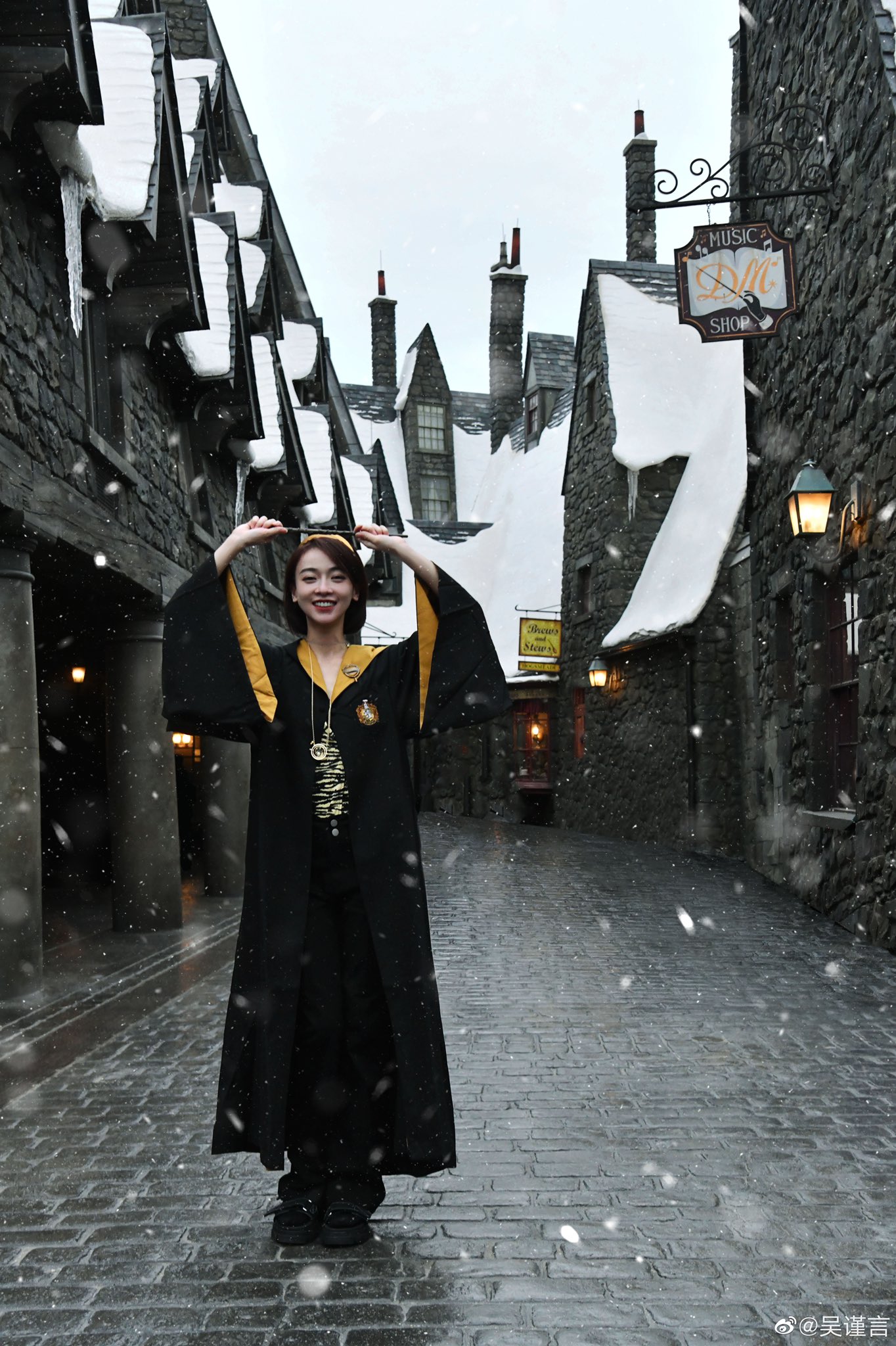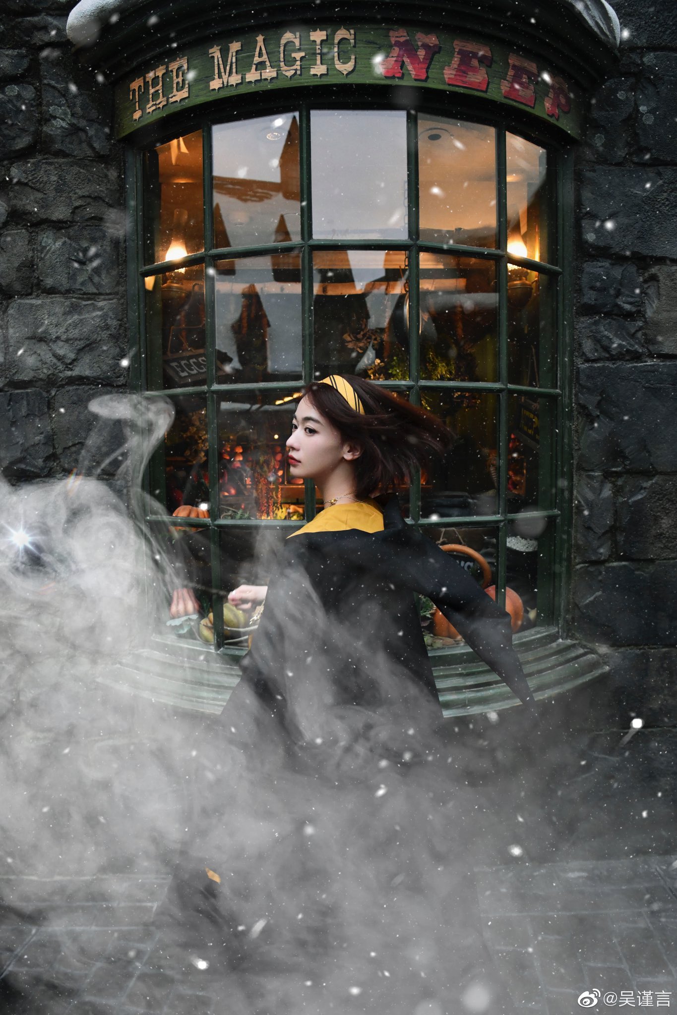 Nữ diễn viên chọn ngay một bộ áo đầm phù thủy màu vàng – chính là màu của nhà Hufflepuff. Cổ đeo dây chuyền có thể đảo ngược thời gian (Time Turner) của Hermione Granger. Rồi Ngô Cẩn Ngôn đi dạo khắp phố phường ở làng Harry Potter. Cô còn khí thế múa đũa thần để làm phép khắp nơi!