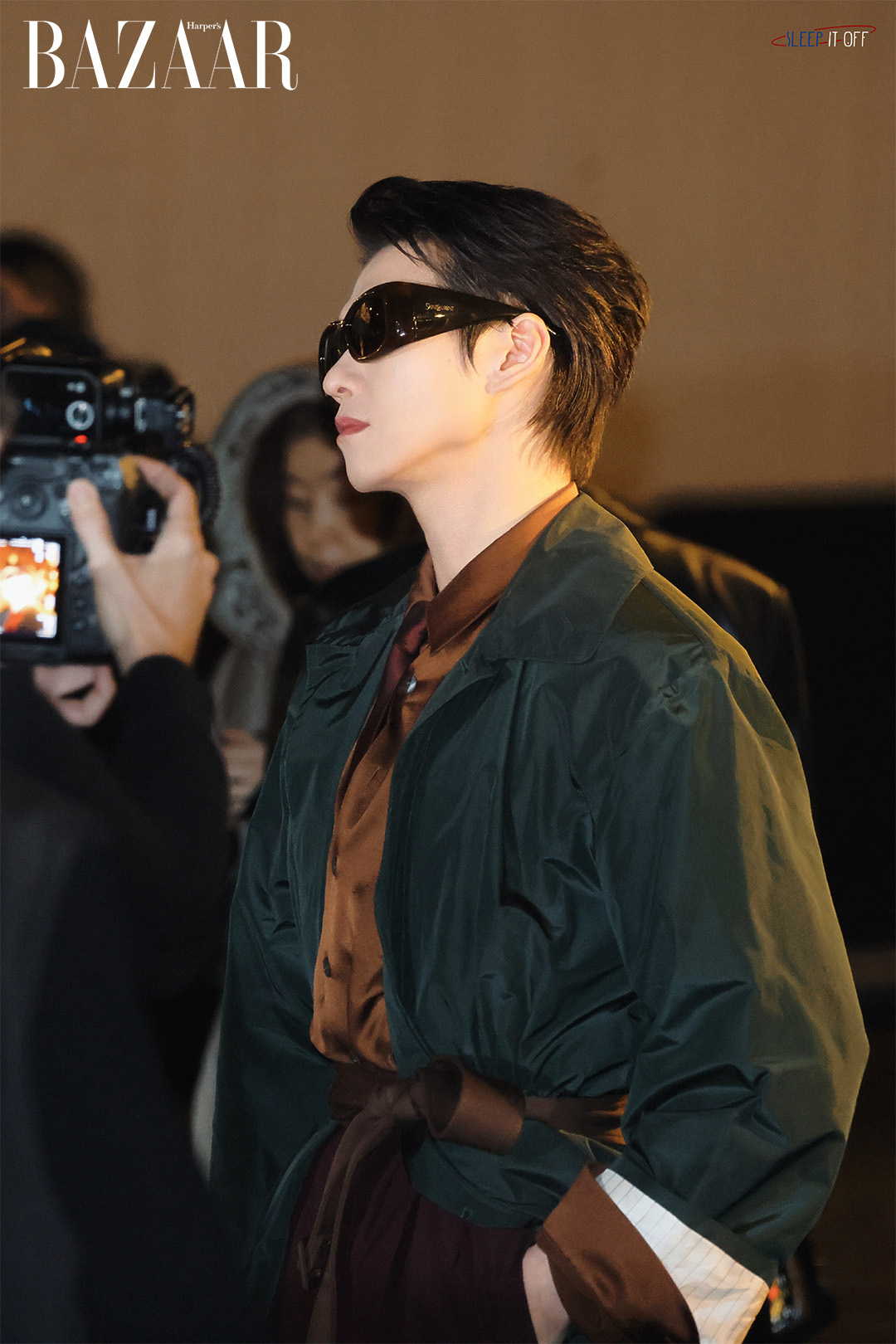Dù không mặc vest đen cổ điển, tổng thể vẫn giữ trọn tinh thần thương thuyết. Ngụy Đại Huân chọn look 13 thuộc bộ sưu tập Saint Laurent Men Xuân Hè 2026. Vẫn đeo kính râm, vẫn có dáng đi ung dung quen thuộc, nhưng vị tổng tài này như sẵn sàng thả lỏng trạng thái tại một quốc gia nơi họ không biết mặt anh. Lối phối đồ màu sắc cực bảnh tỏn với áo choàng xanh và trang phục bên trong màu nâu đỏ đậm chất thời thượng, bởi chỉ có những tay chơi thời trang thời thượng mới dám diện combo màu sắc tương phản này.