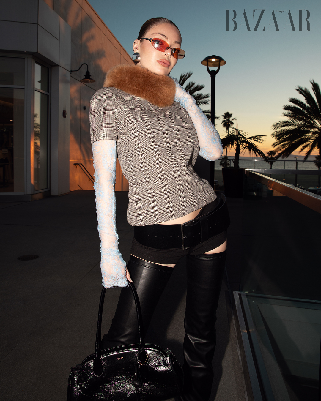 Hat @kangol. Sunglasses @givenchy. Top @marineserre_official. Sweatshirt @jacquemus. Shorts @superdown @revolve. Socks @falke. Boots @courreges. Gloves @maisonmargiela. Bag @chanelofficial.
