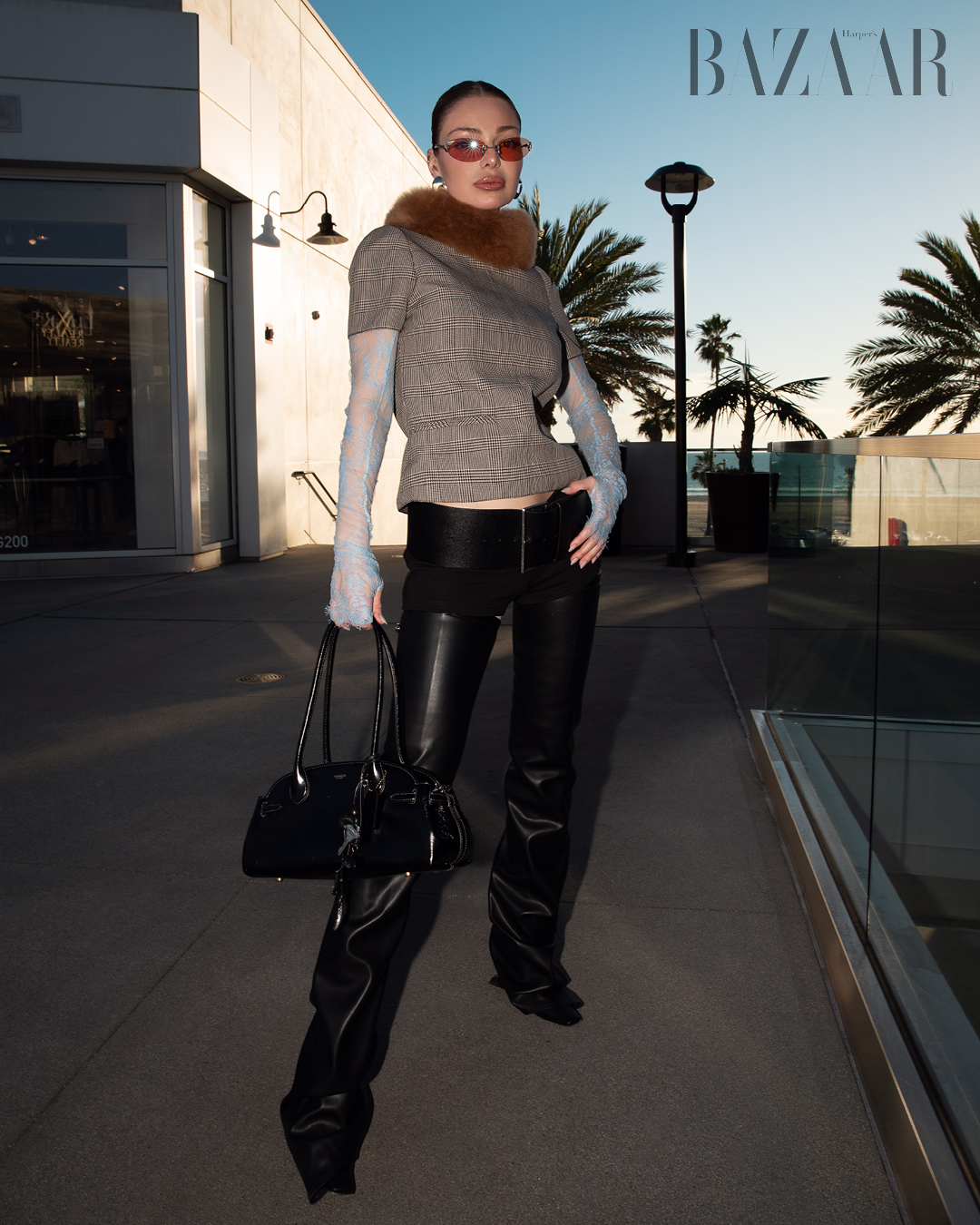 Sunglasses @gentlemonster.  Top @courreges.  Fur collar @peruvianconnection.  Gloves: 2310 STUDIO. Shorts @superdown @revolve.  Boots @theattico.  Bag @coach.  Belt @allsaints.  Earrings @coperni.