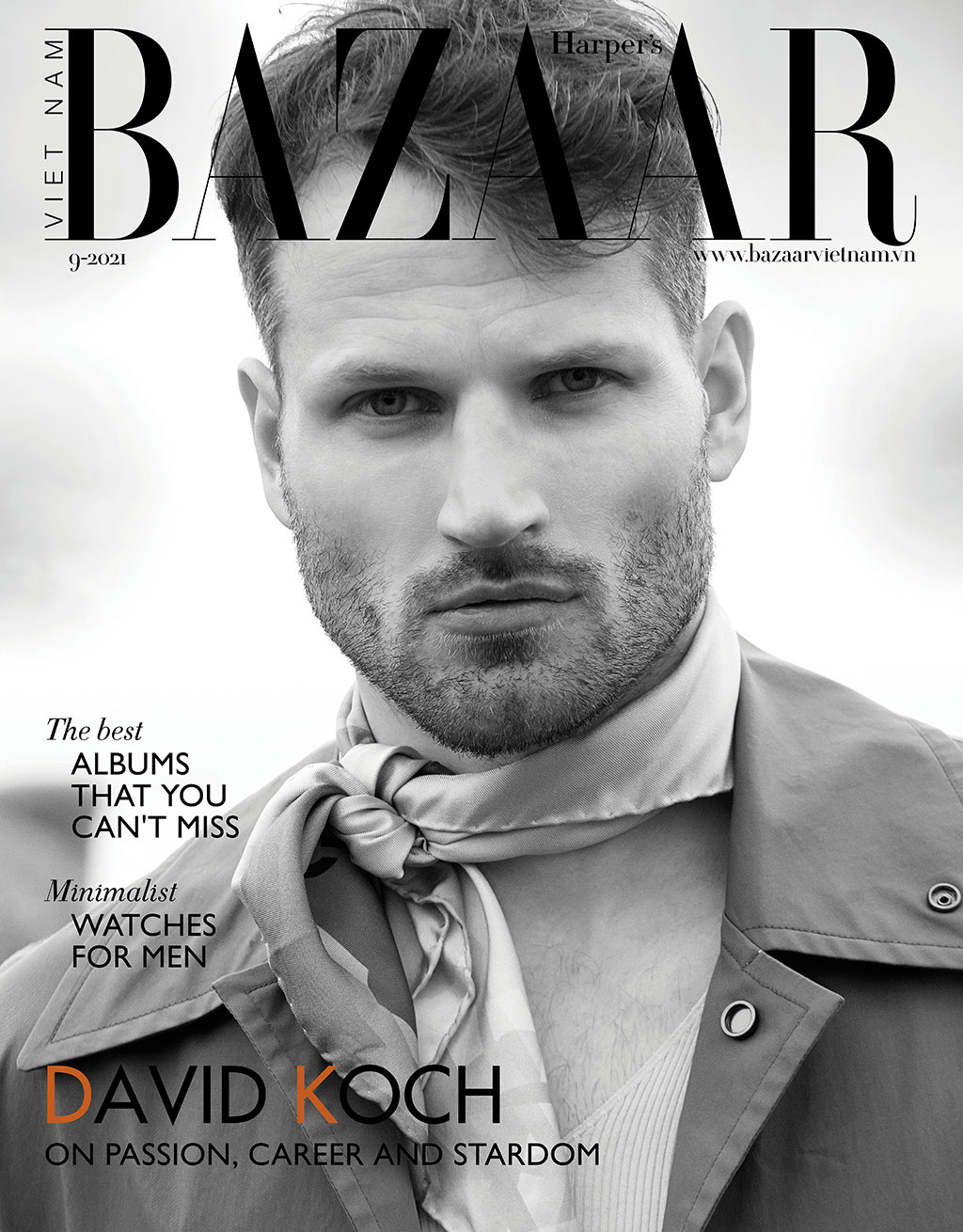 David Koch chia sẻ về cách định hướng phát triển nghề người mẫu. Anh mặc áo khoác, T-shirt, quần và giày, SALVATORE FERRAGAMO. Khăn lụa, GINA CUSACHS