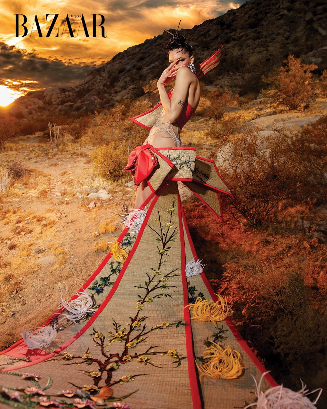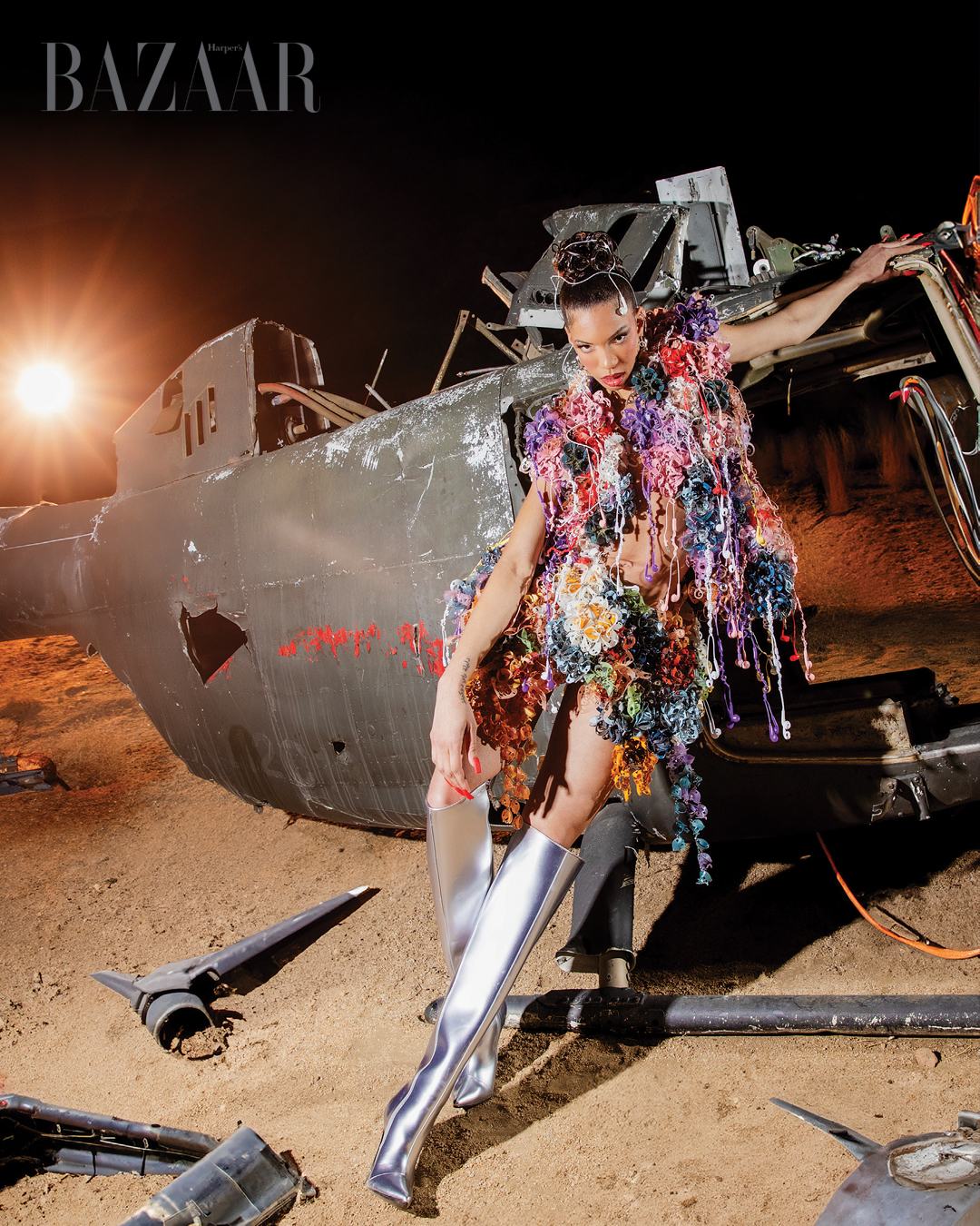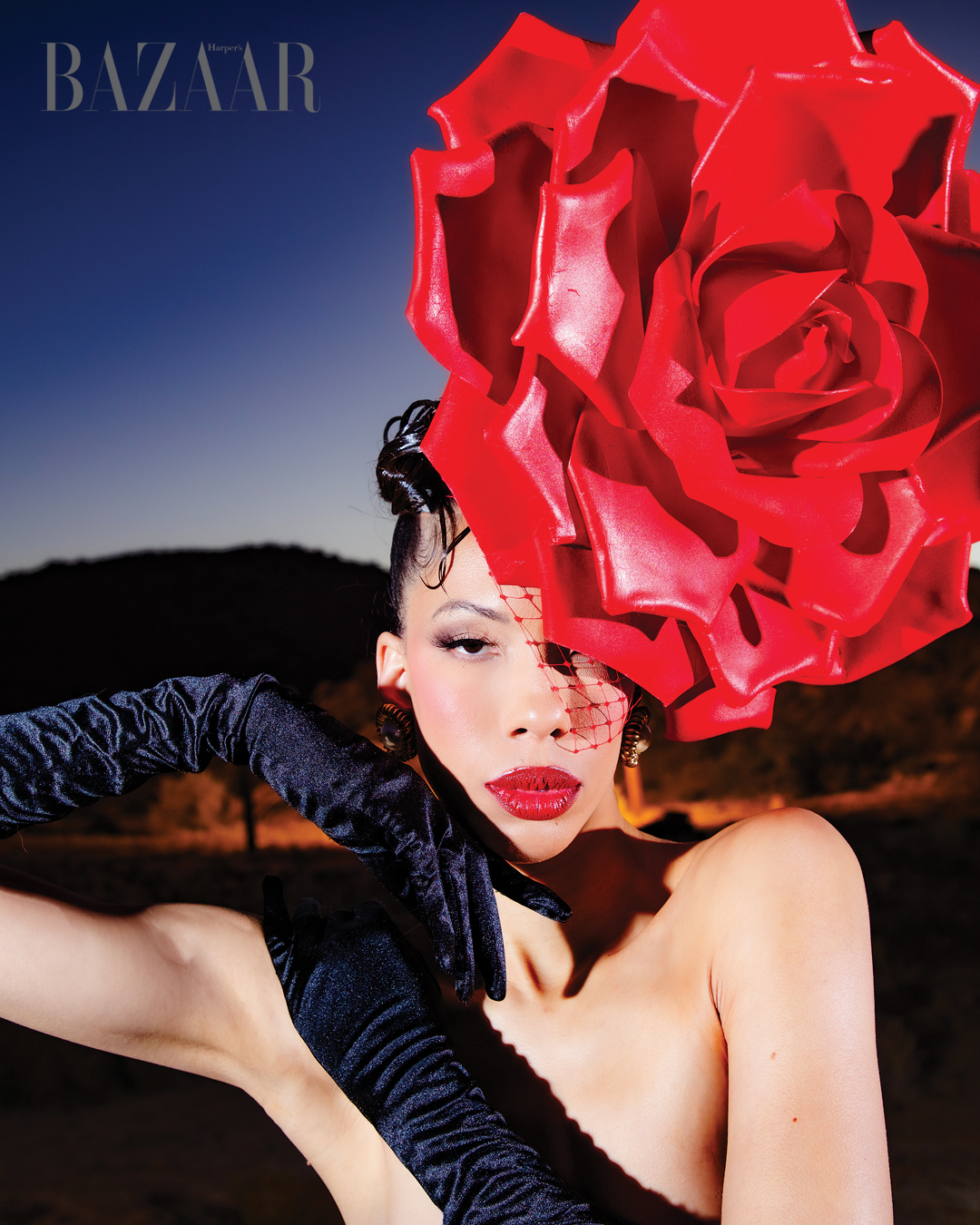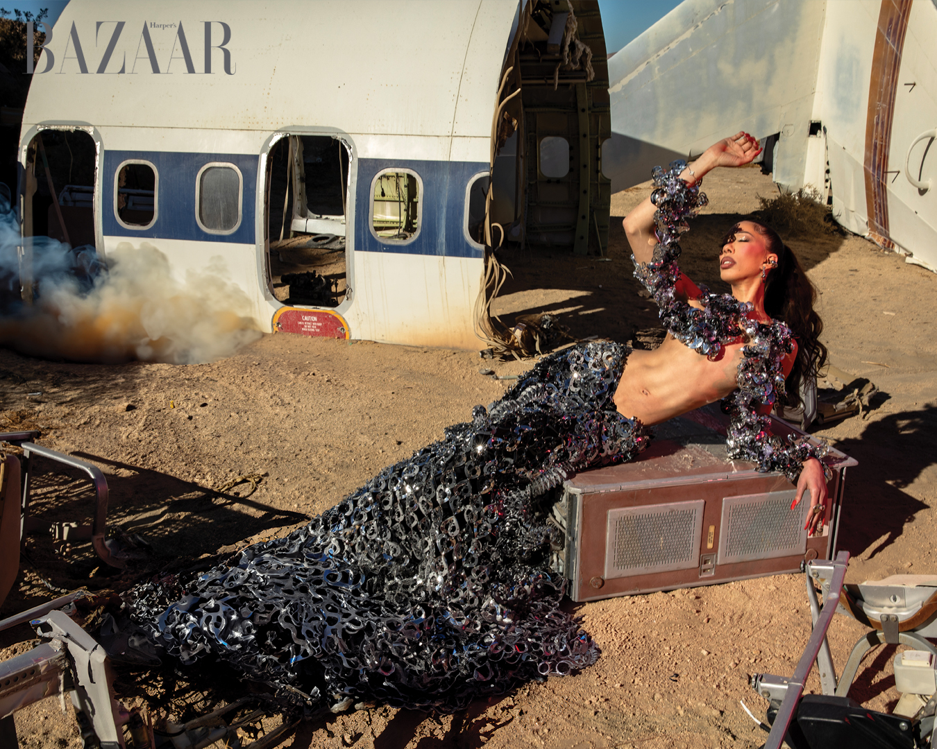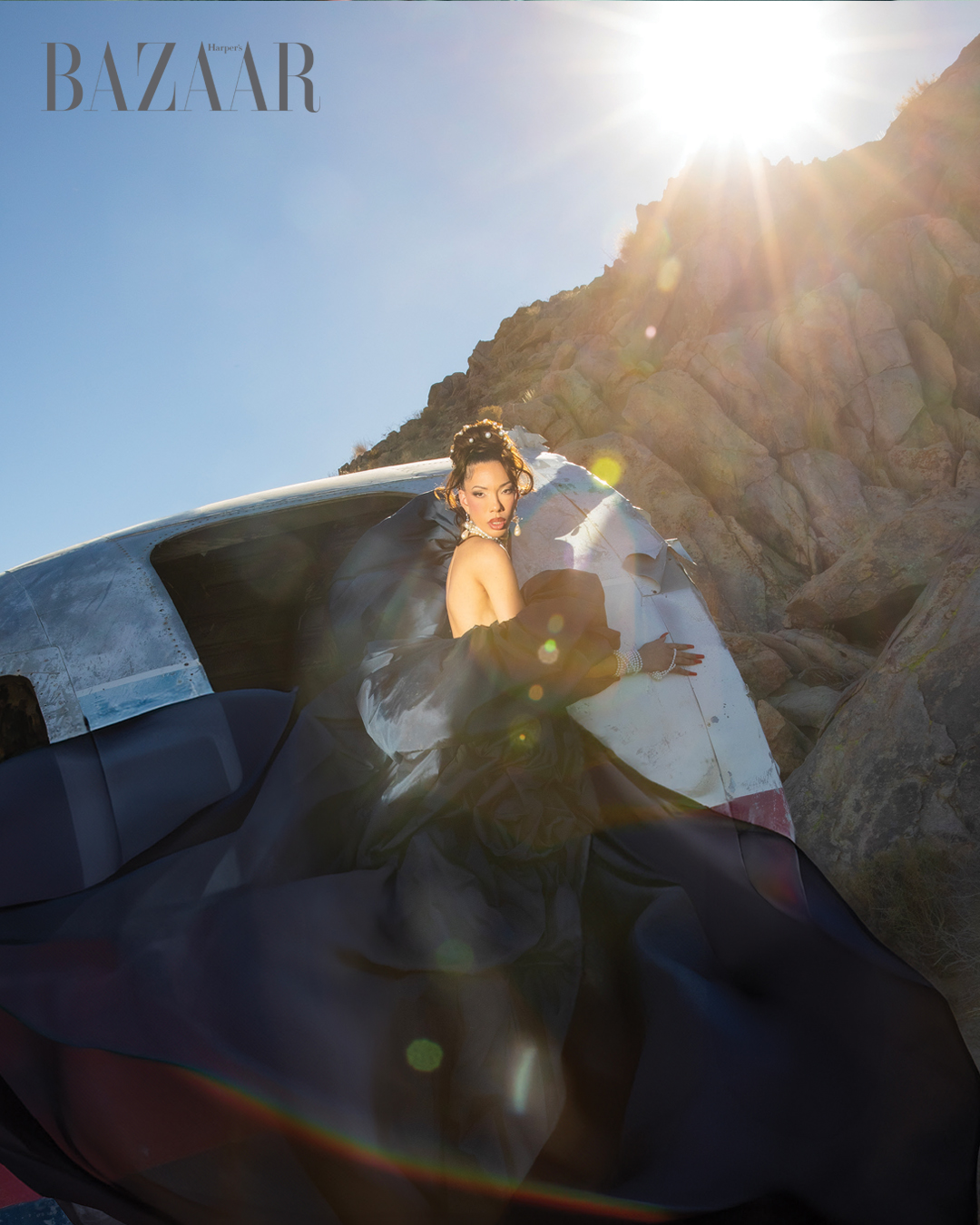 Daiyaana Muhammad trên Harper’s Bazaar Việt Nam, 9/2025. Đầm, Đỗ Long. Trang sức, The Jewelry Album. Giày, Steve Madden.