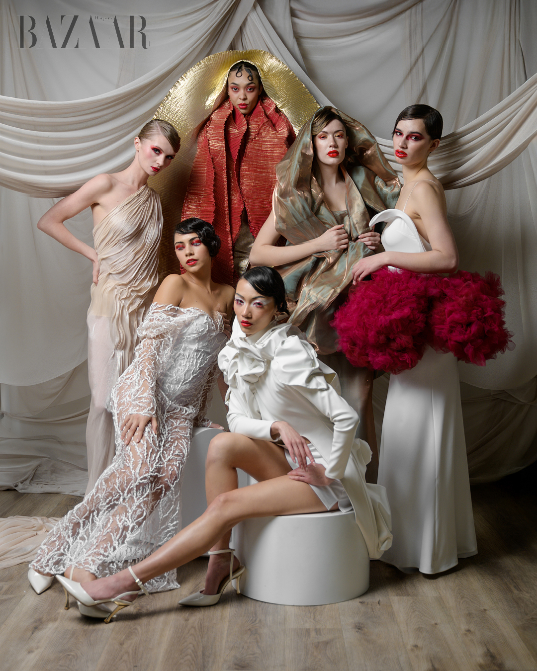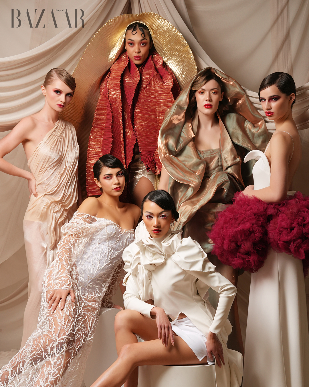 The SkyeAire Official collection presents six distinct interpretations of womanhood, each expressed through architectural silhouettes and couture-inspired construction. Ethereal lace, sharply tailored ivory, molten metallic draping, and dramatic crimson volume create a visual dialogue between softness and strength, elegance and power. Each look is designed to feel both commanding and fluid, celebrating femininity that is confident, dimensional, and unapologetically present.