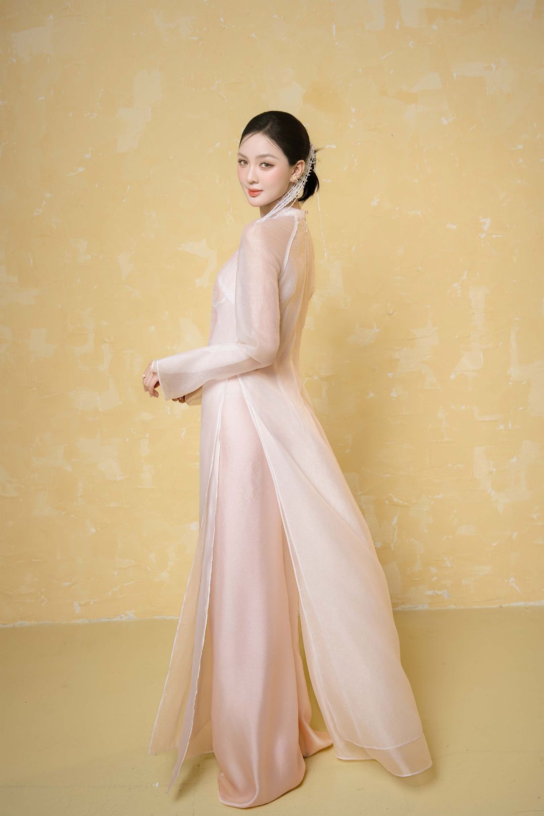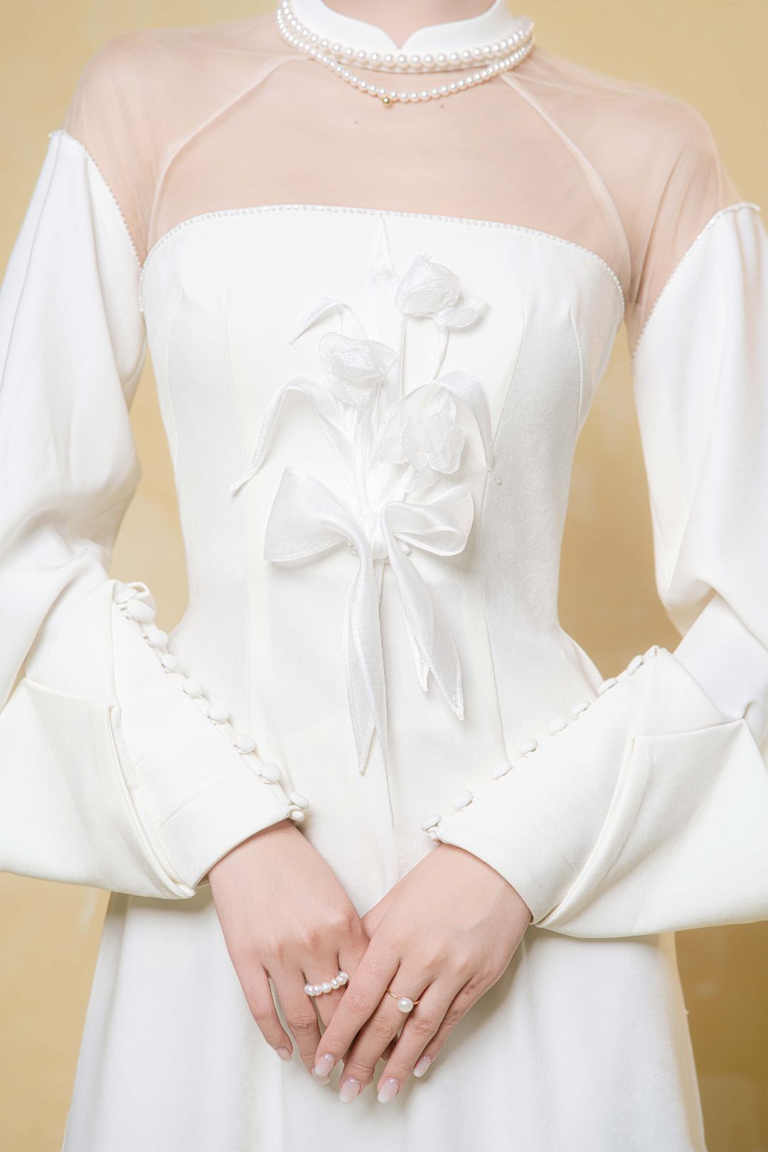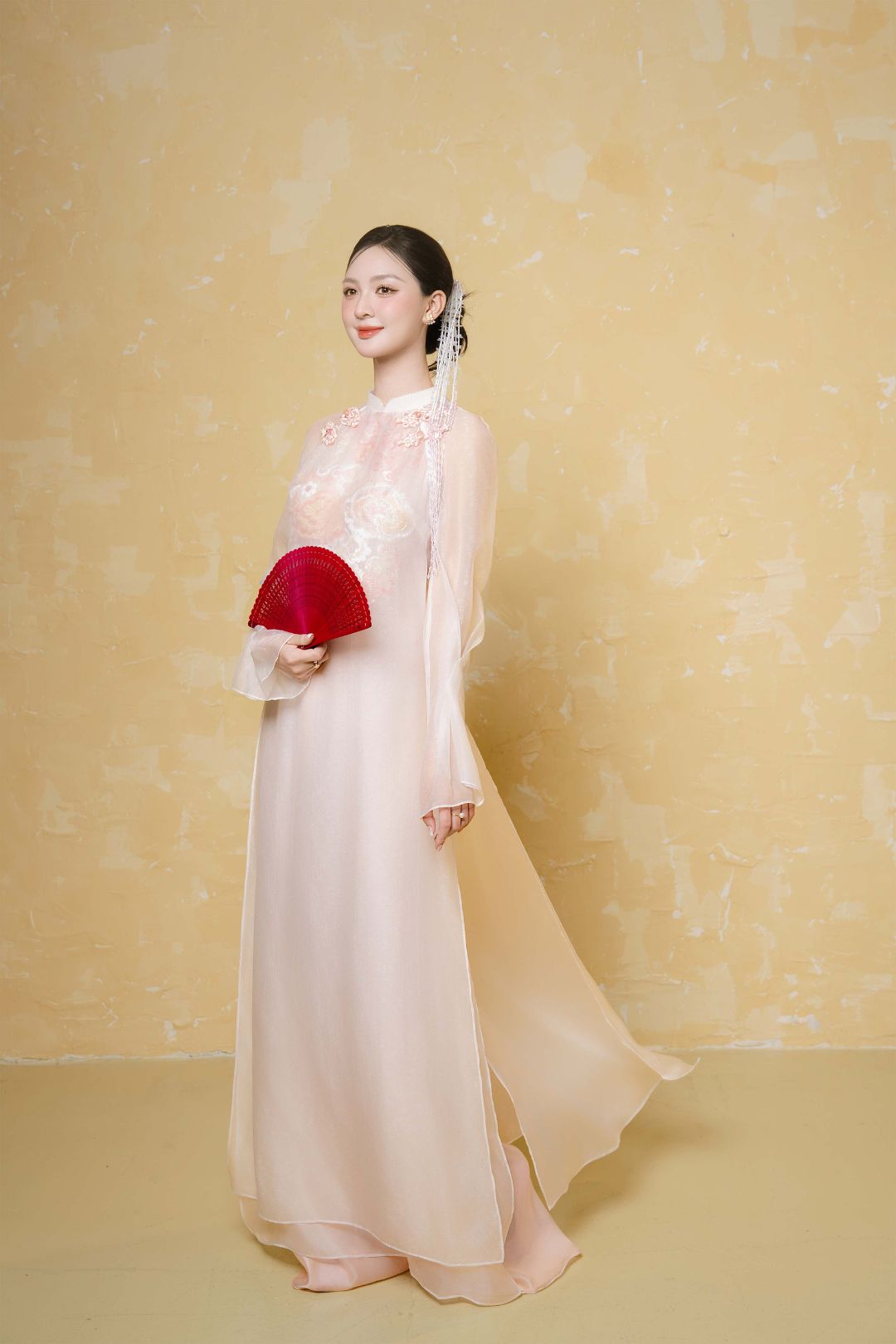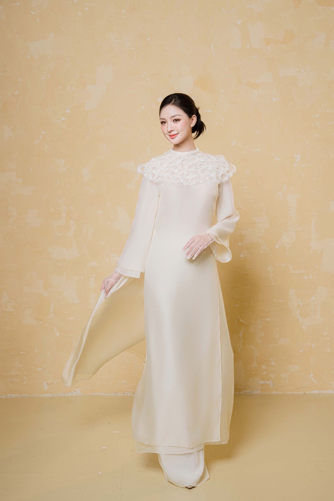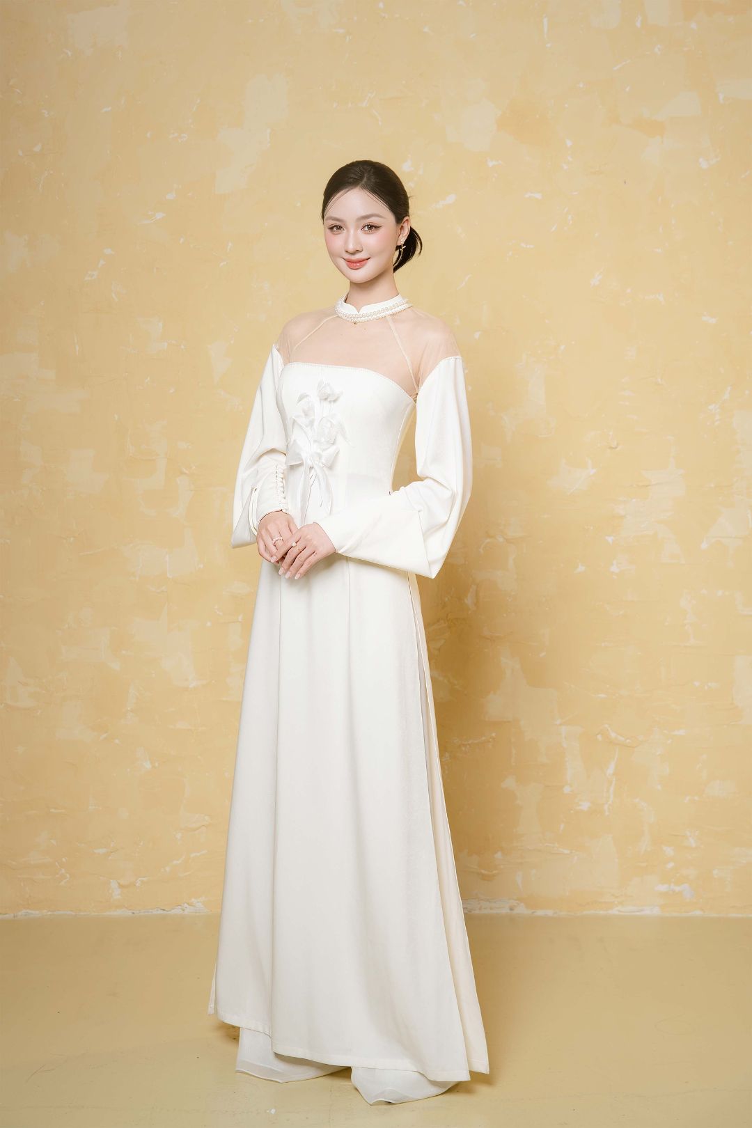 Bảng màu của bộ sưu tập áo dài Tết 2026 từ Đỗ Long cũng mang đậm tính biểu tượng. Trắng ngà và Hồng phấn gợi mở hình ảnh những áng mây trôi lững lờ giữa bầu trời, được nhấn nhá bằng kỹ thuật thêu tay và đính nhũ nhẹ tạo chiều sâu thị giác.
