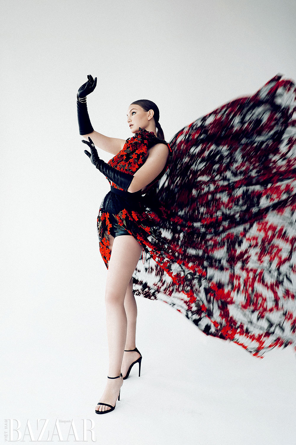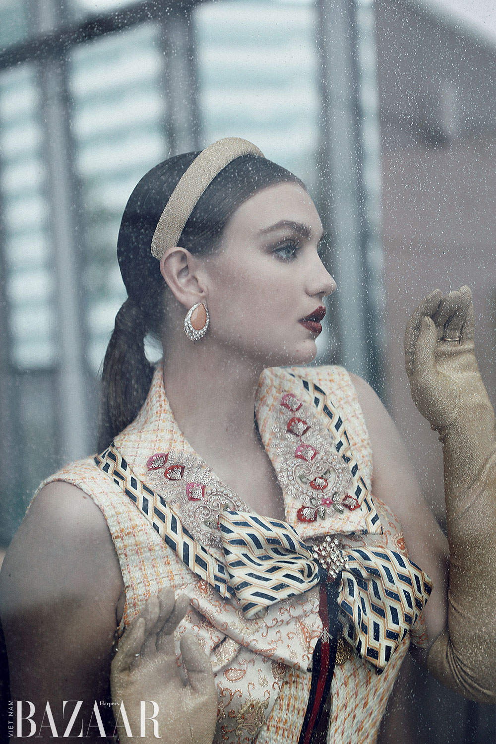 Vest: ReFresh Studios. Băng đô của stylist. Găng tay: Ke Collection. Nhẫn: Zelik. Bông tai: Prajje Oscar