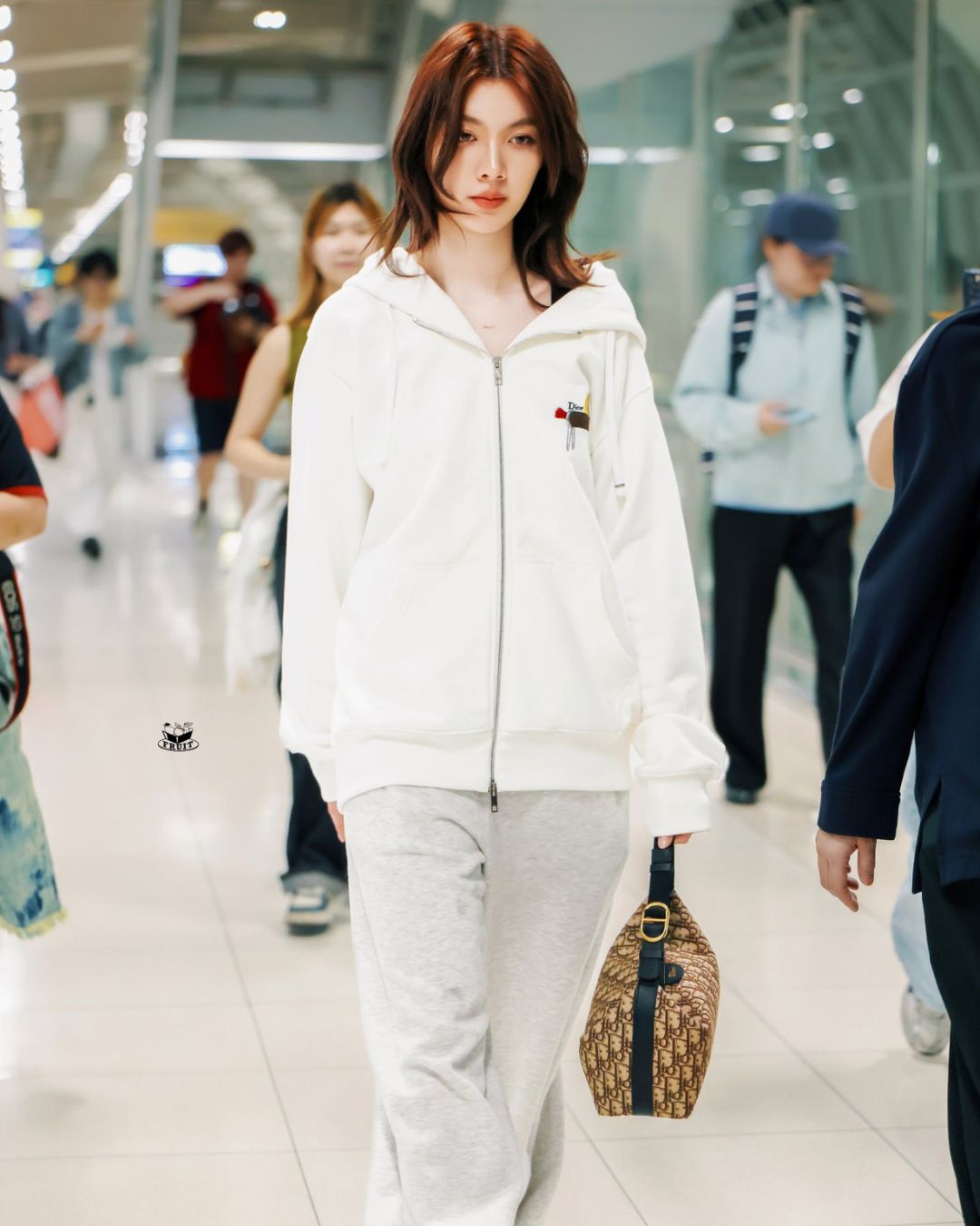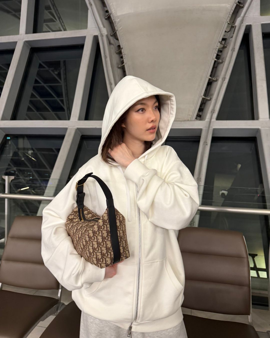 Trong chuyến bay, Orm ưu tiên sự thoải mái với các mẫu Hoodie zip oversize và quần thun ống rộng. Những trang phục thiên về phong cách tối giản không hề lạc lõng khi phối kèm Dior Jett Pouch, nhờ việc chiếc túi xách này có họa tiết Dior Oblique ấn tượng về mặt thị giác. Kiểu dáng gọn gàng cùng quai xách điều chỉnh của túi giúp Orm có thể linh hoạt trong cách đeo túi, từ cầm tay kẹp nách đến xách tay.