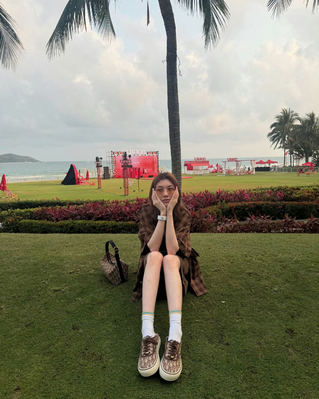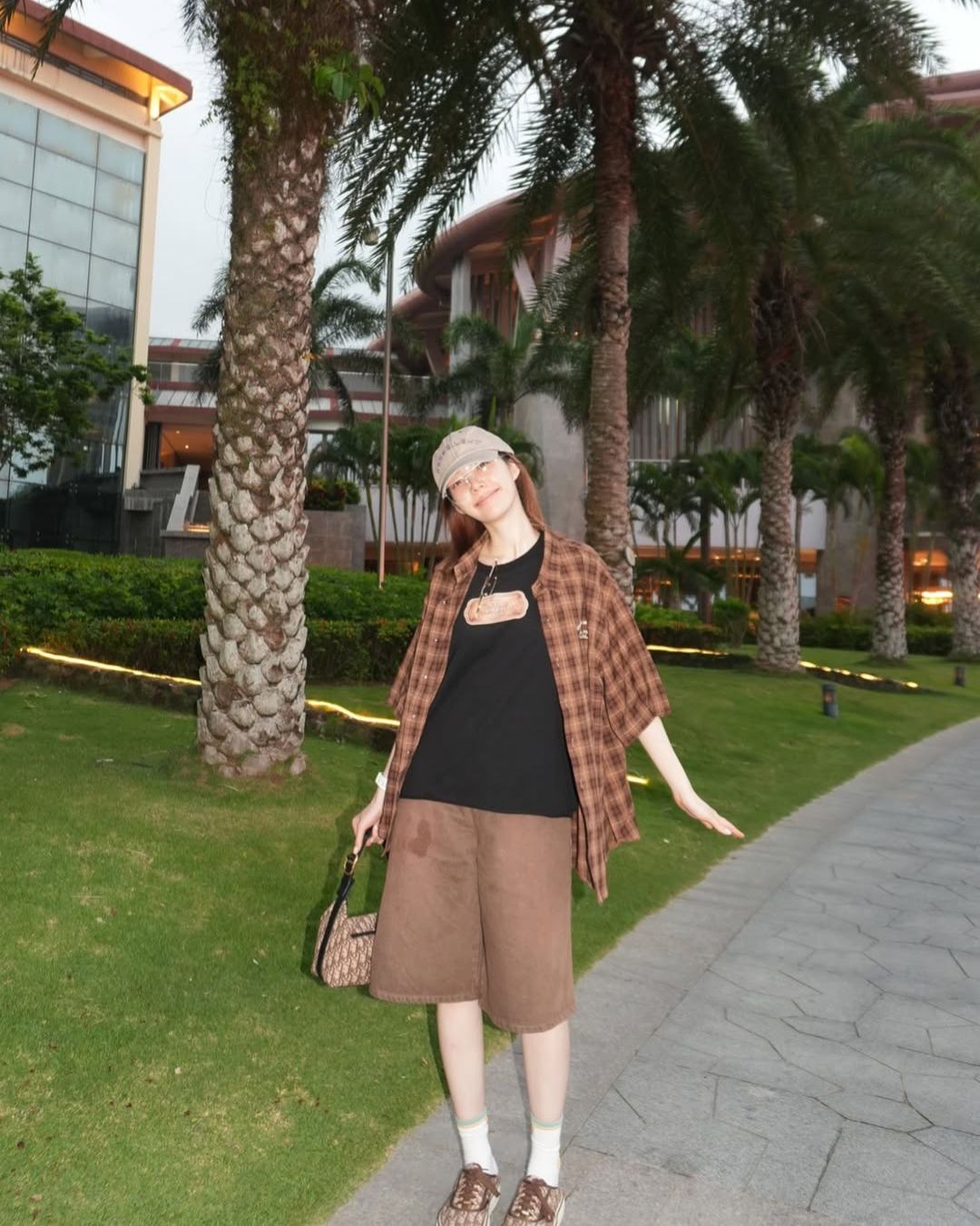 Trong hình ảnh được đăng tải mới nhất trên Instagram, Orm Kornnaphat thử nghiệm với bản phối ton-sur-ton. Áo caro nâu, quần short lửng màu nâu tương đồng về màu sắc với chiếc túi xách. Chiếc túi Jett Pouch mang sắc nâu đặc trưng của Dior đóng vai trò là “mỏ neo” màu sắc, kết nối hoàn hảo với chiếc áo sơ mi caro nâu khoác ngoài và chiếc quần short lửng màu nâu đậm. Việc sử dụng các sắc độ nâu khác nhau trên cùng một tổng thể giúp bộ trang phục có chiều sâu mà không bị rối mắt. Chiếc mũ lưỡi trai màu beige và đôi kính cận hoàn thiện vẻ ngoài geek chic dễ thương.