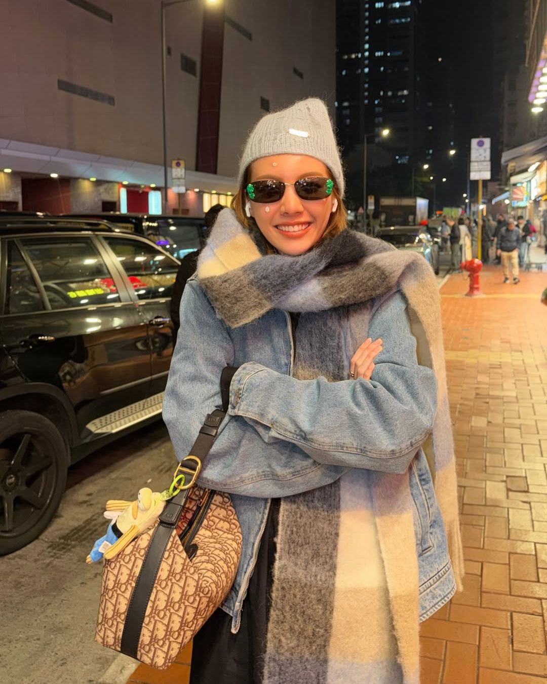 Ở một bản phối cũng casual không kém, Orm Kornnaphat tiếp tục chọn túi xách Dior Jett Pouch cùng denim, nhưng lần này mặc kèm áo len dệt kim có họa tiết cỏ bốn lá may mắn. Logo “Dior” nhỏ trên áo tạo sự kết nối thương hiệu trực tiếp với chiếc túi Jett Pouch. Chiếc túi xách Dior lần này nằm ngang hông Orm Kornnaphat, đè lên lớp áo đen. Họa tiết Dior Oblique màu beige nổi bật trên nền áo đen tuyền, tạo điểm nhấn thị giác ngay lập tức.
