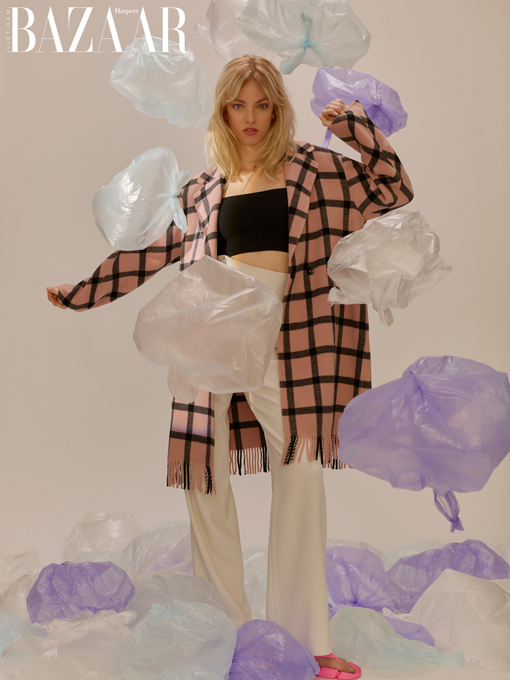 Áo choàng (coat), Marc Cain. Áo (top) Stella McCartney. Quần (pants), Stella Mccartney. Giày (shoes) Balenciaga.
