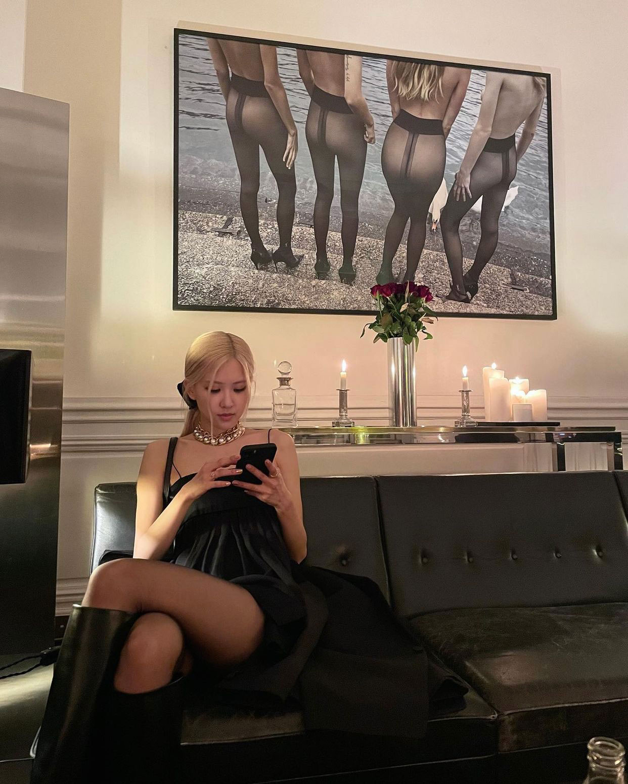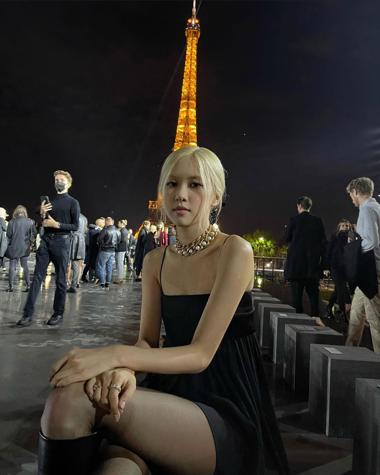 Dự show Saint Laurent Xuân Hè 2022, Rosé Park chọn đầm đen hai dây nữ tính, được làm từ chất liệu vải xuyên thấu gợi cảm. Cô hoàn thiện vẻ ngoài với đôi bốt cao đến đầu gối. Nhìn tổng thể, phong cách của Rosé được mix giữa gothic, punk/rock và chút ngọt ngào của chiếc đầm công chúa.