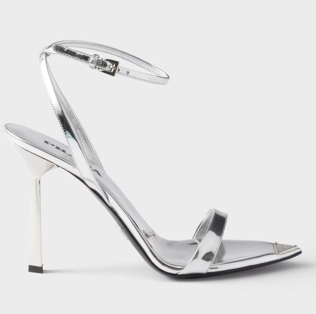 Kết hợp cùng chiếc váy là đôi giày cao gót bằng da ánh kim của Prada. Điểm nhấn của đôi giày chính là phần gót hình khối hình học lấy cảm hứng từ logo tam giác biểu tượng của hãng, mang lại vẻ hiện đại và sắc sảo cho tổng thể trang phục. Thiết kế trị giá 1.290 đô-la Mỹ.