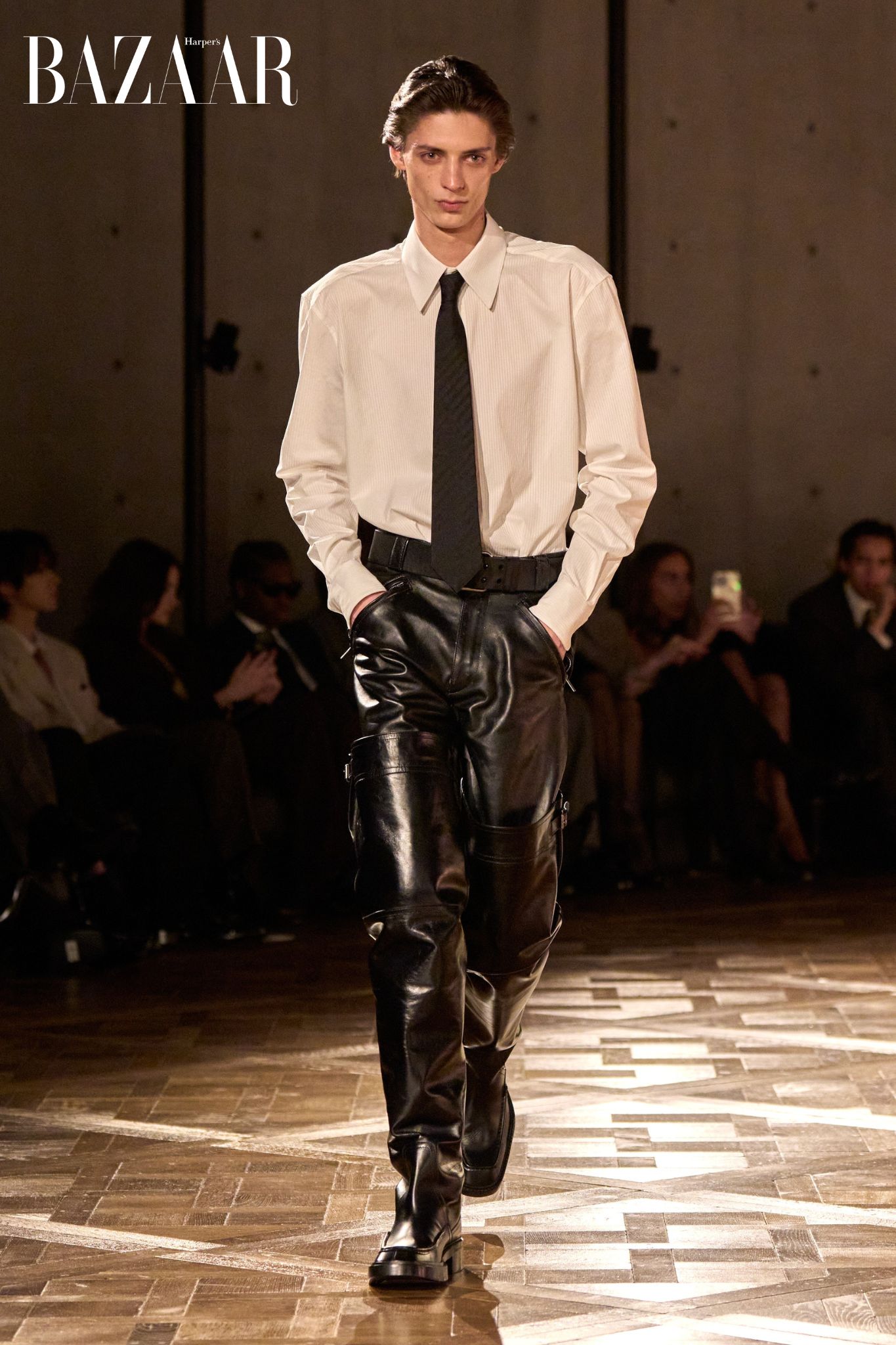 Tuy nhiên điểm nhấn đặc biệt nhất của BST Saint Laurent Men Thu Đông 2025 là những đôi bốt cao đến đùi, trông giống như đôi ủng lội nước làm bằng da bóng. Những chiếc bốt này không có phần cao gót thường thấy ở Saint Laurent những mùa gần đây (mùa nam gần nhất thì trung bình những đôi giày và bốt đều có phần gót cao độ 5 phân trở lên!). Trong nhiều bộ trang phục, những chiếc bốt này trông như một chiếc quần liền giày da ta từng thấy ở Maison Margiela hay Balenciaga.