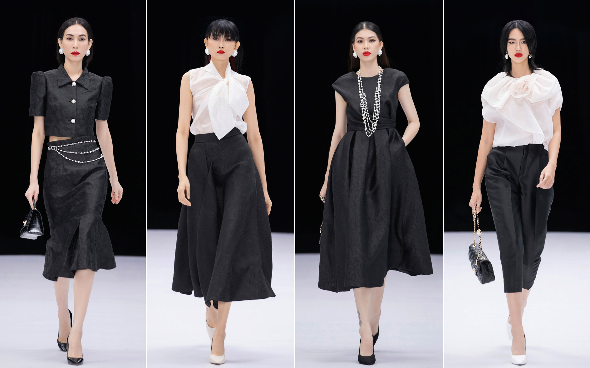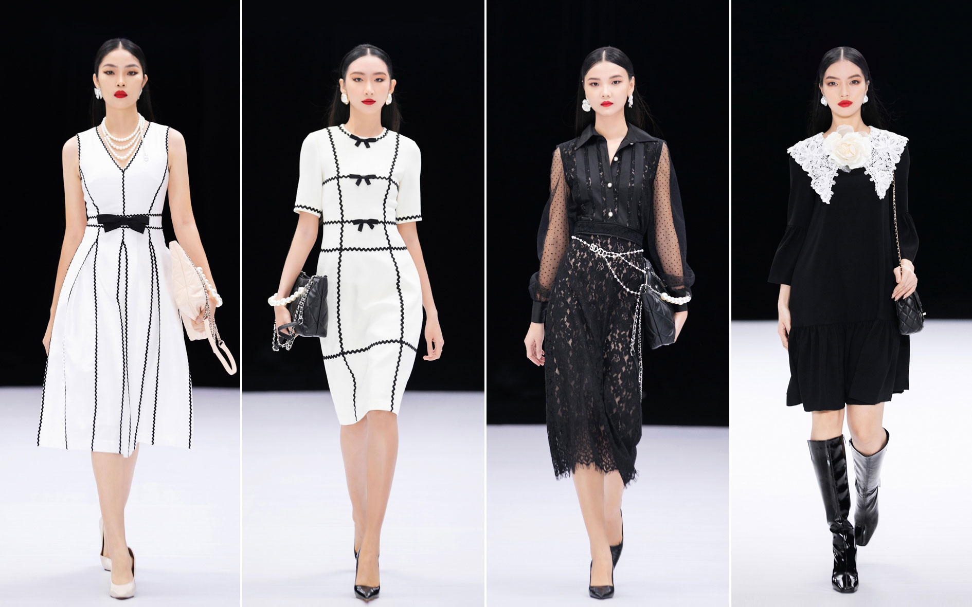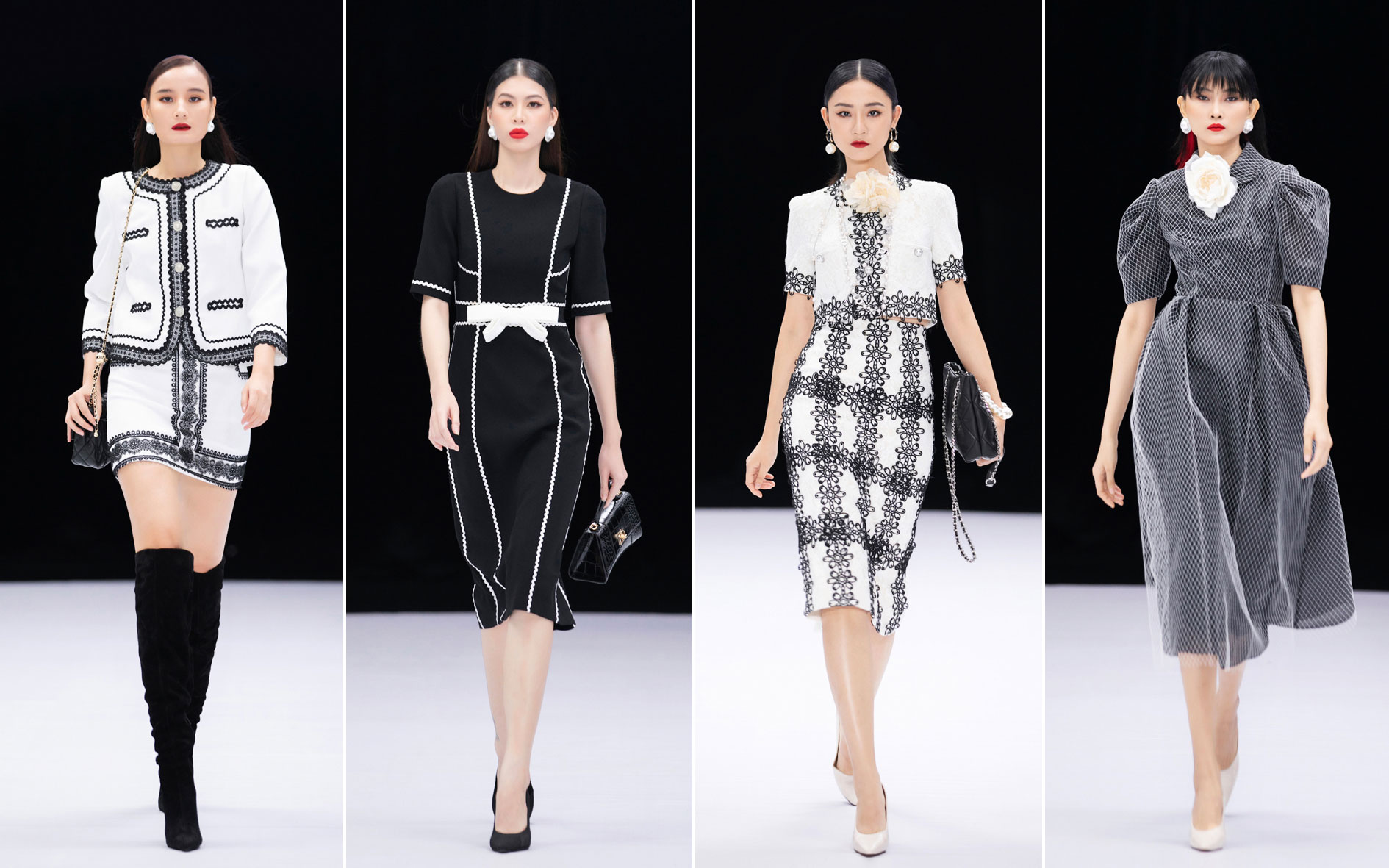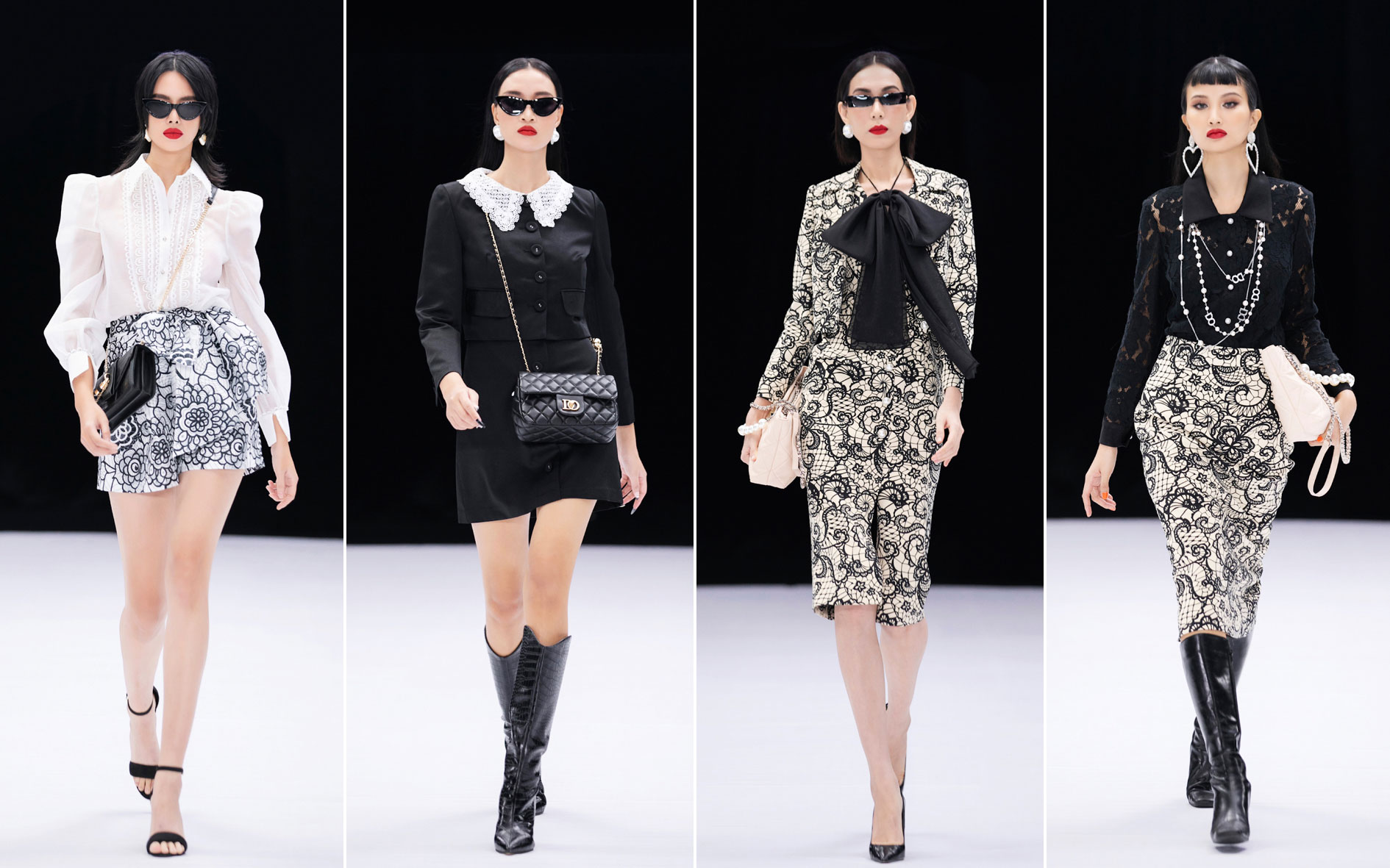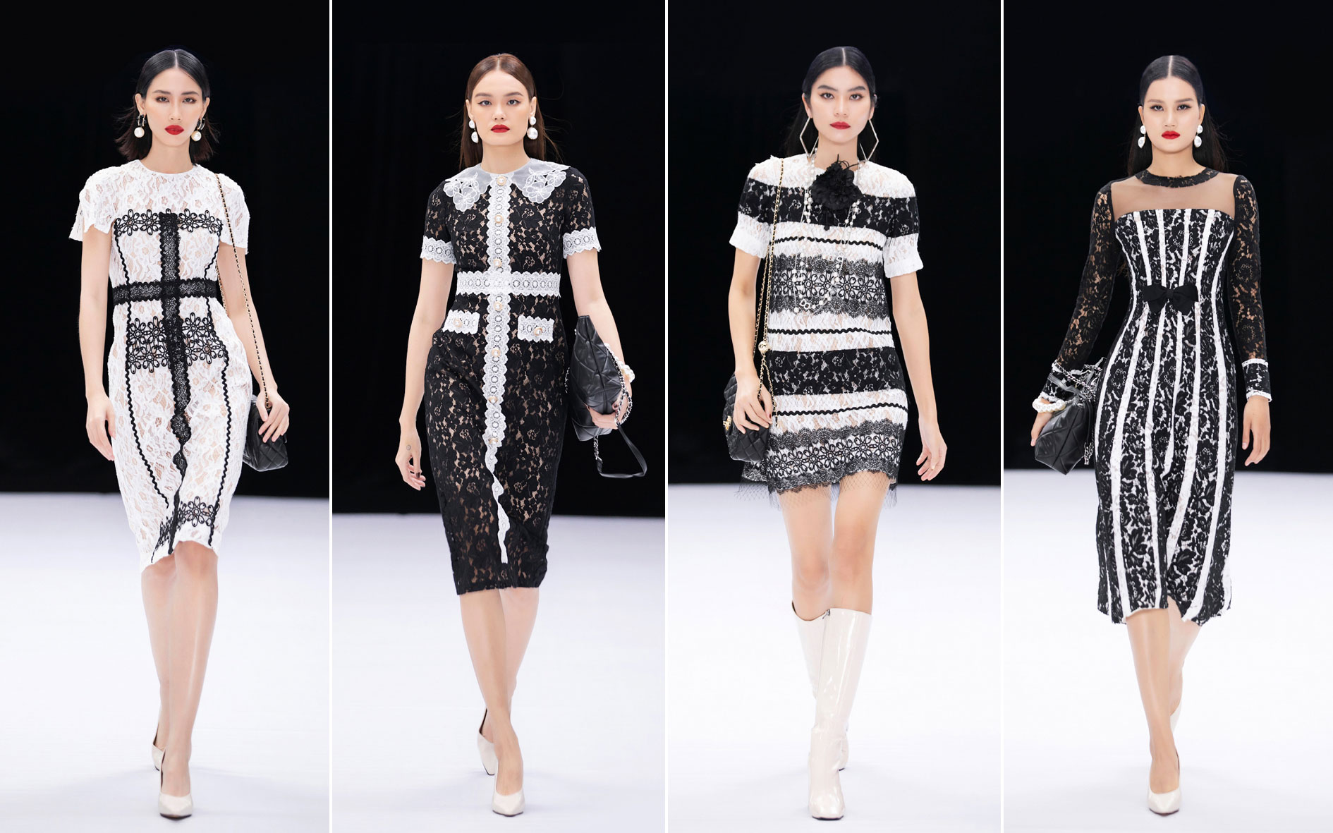 Điểm nhấn chính của các trang phục đen và trắng là ren. Chất liệu mỏng và xuyên thấu này luôn gợi lên nét gợi cảm, quyến rũ cho người mặc. Giữ lấy đặc tính cố hữu này, Đỗ Mạnh Cường đã tạo cho ren vẻ thanh lịch khi kết hợp nó cùng voan, cotton… Nhà thiết kế cũng áp dụng kỹ thuật ráp nối nhiều chất liệu ren cùng nhau. Đây là kỹ thuật thường thấy trong thời trang cao cấp, nay được áp dụng vào dây chuyền sản xuất công nghiệp.
