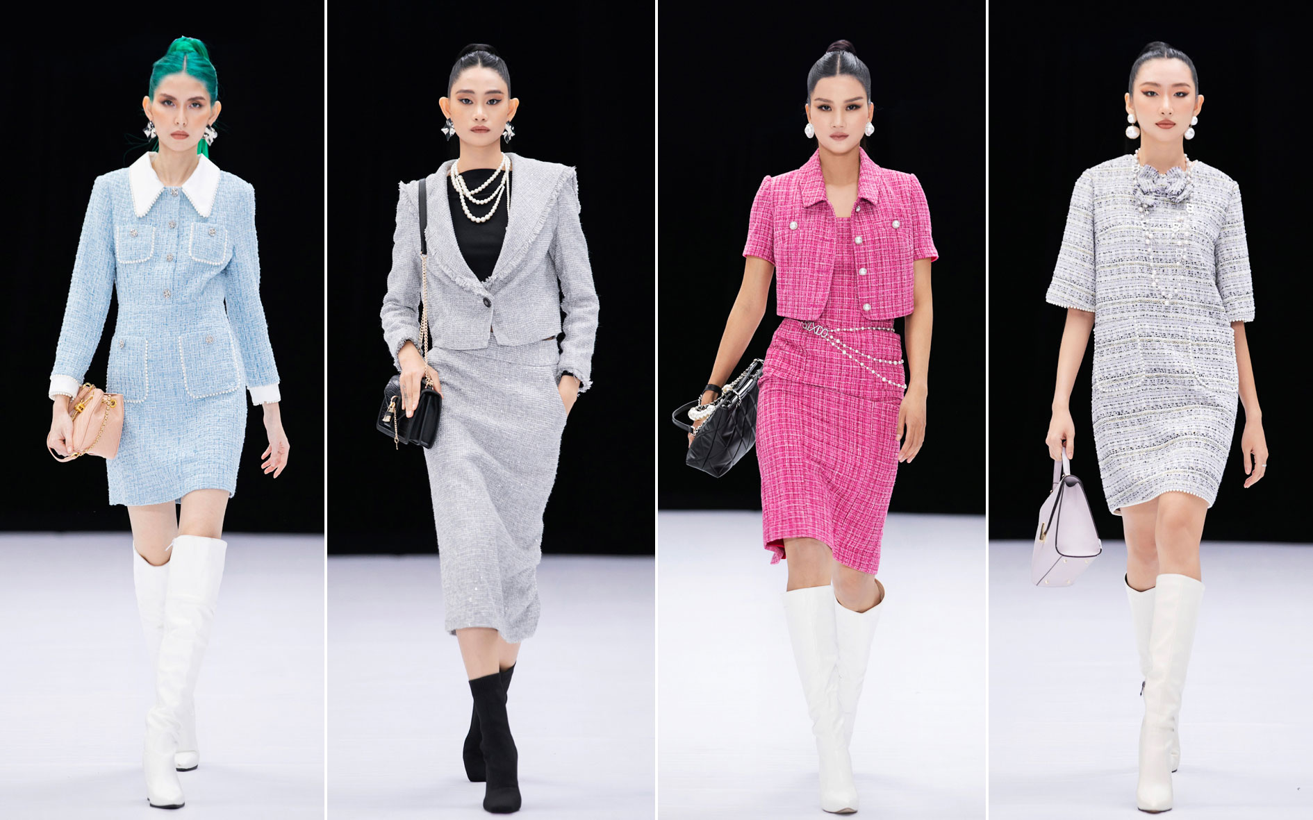 Để tạo sự tương phản cho trang phục, trên nền vải tweed dệt dày dặn, anh đã thêm thắt những chiếc nơ nữ tính. Nơ là chi tiết trang trí được những nhà mốt Pháp yêu thích, từ Dior, Chanel qua đến Lanvin, Celine… Chất liệu mỏng manh của những chiếc nơ tạo nét chấm phá lạ mắt cho set đồ vải tweed.