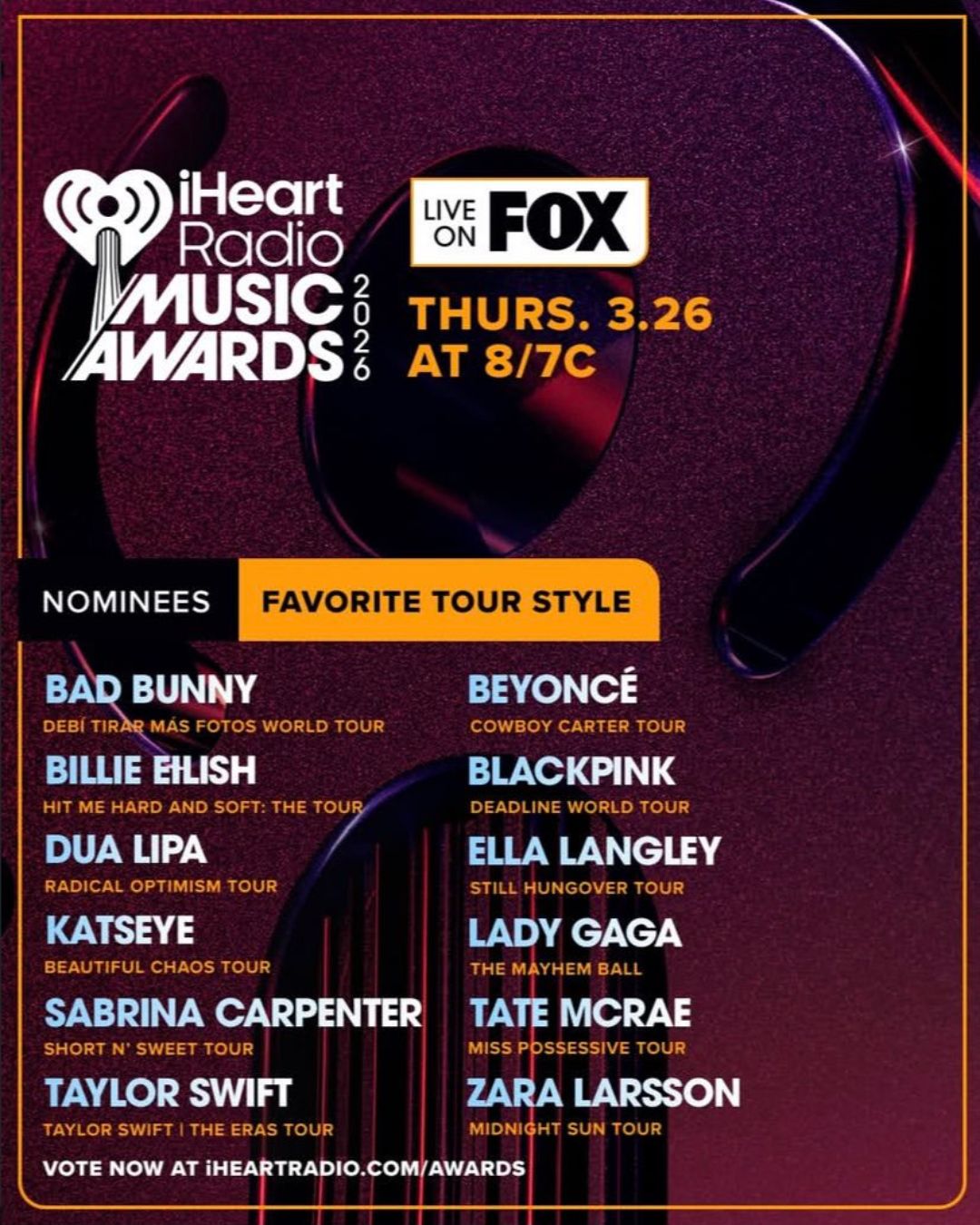 iHeartRadio Music Awards 2026 sẽ được truyền hình trực tiếp vào ngày 26/03 trên kênh Fox. Ảnh: iHeartRadio