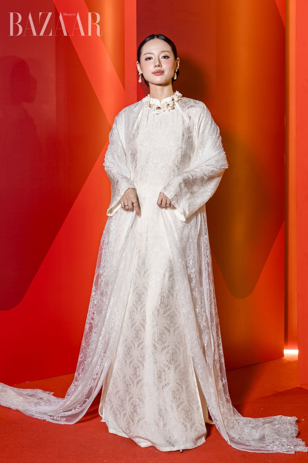 Ta có Miss International 2024 Thanh Thủy với cả một vườn bướm trắng chao liệng trên áo choàng, khiến hương sắc của nàng hậu thêm thăng hoa, Chi Pu với áo dài đính kết bạc cao sang, kiêu kỳ. Ở phía tiệm cận về phong cách, Á hậu Ngọc Hằng tối giản nhưng không hề kém lộng lẫy với phần vai áo nối thành khăn choàng, kết hợp gấm lụa nước nhà cùng găng tay opera mang giá trị phương Tây.