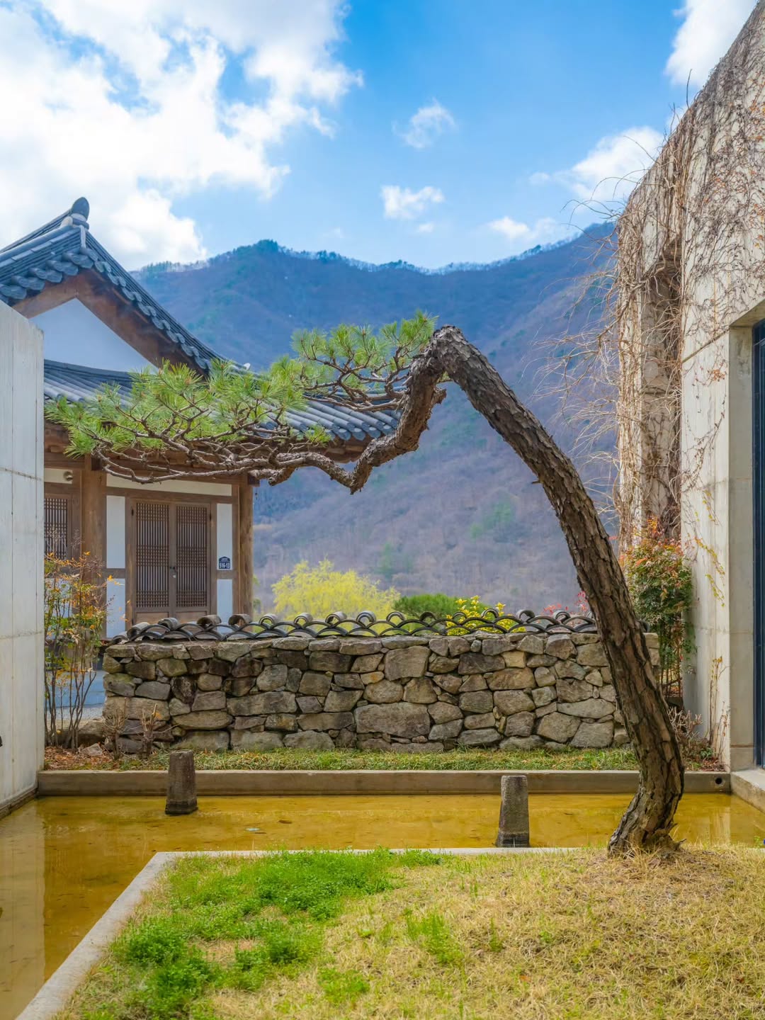 Những căn nhà cổ Hanok thường được xây mặt tiền hướng về phía Nam để đón nắng tốt vào mùa đông và trú trong bóng râm vào mùa hè. Nhưng hanok của Awon Hotel lại hướng tầm nhìn về phía núi Jongnam, với dụng ý đứng ở bất kỳ đâu trong căn nhà cũng có thể thu trọn vào tầm mắt những đường núi trầm mặc, sâu lắng. Kiến trúc hanok và cảnh quan vì thế như hòa làm một. Từ Awon Hotel, bạn có thể thưởng trà và nhìn xuống toàn bộ làng hanok Oseong, nơi vừa được bình chọn vào danh sách 100 điểm du lịch tiêu biểu của Hàn Quốc năm 2026.
