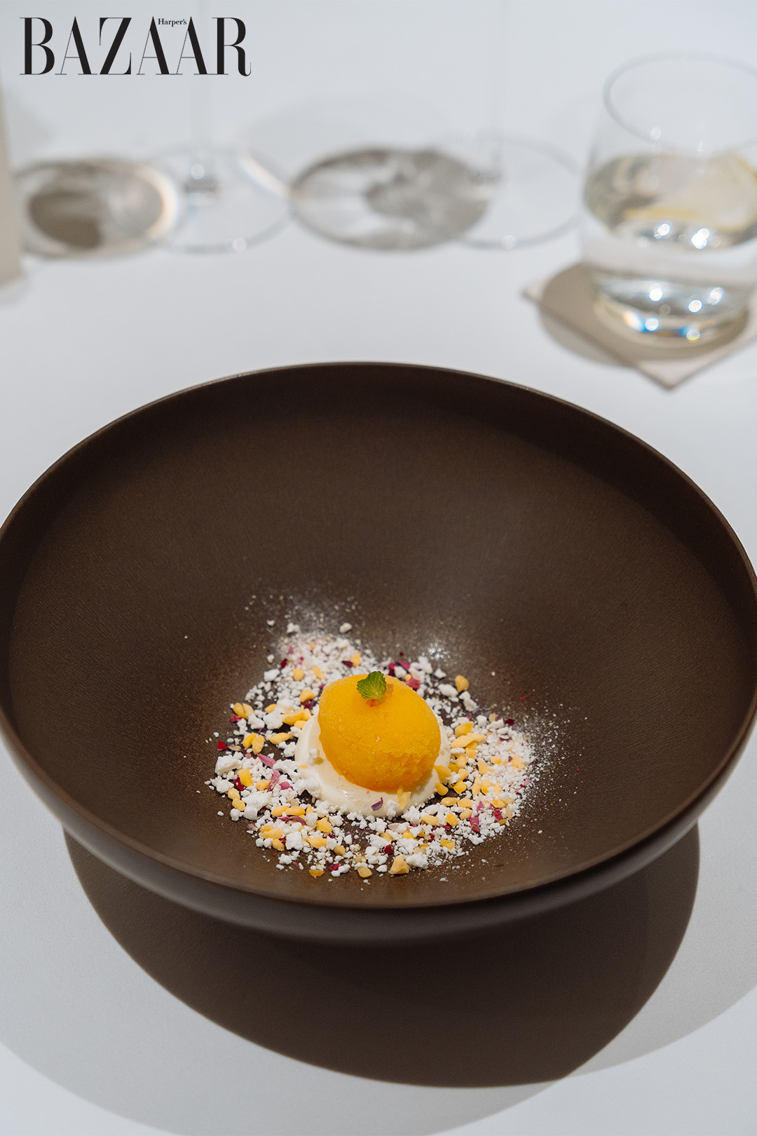 Sorbet quýt với bọt sữa chua và chanh trứng cá hồi mang lại sự tươi mới trước khi bước sang món tráng miệng cuối: burdock mousse cake cùng kem ngưu bàng sô cô la trắng. Ngưu bàng chiên tạo độ giòn thú vị, kết cấu mousse mịn màng.