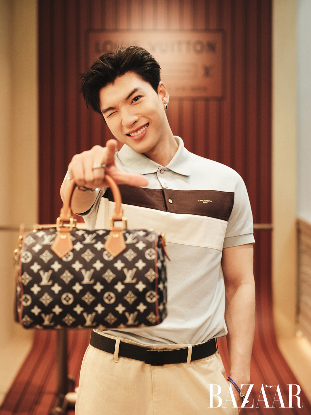 Bước vào tầng hai, HIEUTHUHAI dừng khá lâu ở Keepall Lobby. Chiếc Keepall, biểu tượng ra đời từ năm 1930, được trưng bày như trung tâm của một sảnh khách sạn cổ điển. Anh chạm tay lên lớp Monogram Canvas và nói vui rằng đây là kiểu túi “nhìn là muốn xách đi đâu đó ngay lập tức”. Ở khu Speedy P9 Safe Room bên cạnh, phiên bản Speedy tái diễn giải dưới góc nhìn đương đại khiến anh đặc biệt ấn tượng với quy trình chế tác hàng trăm công đoạn. “Nhìn thì quen, nhưng càng nghe kể mới thấy độ công phu phía sau”, anh chia sẻ.