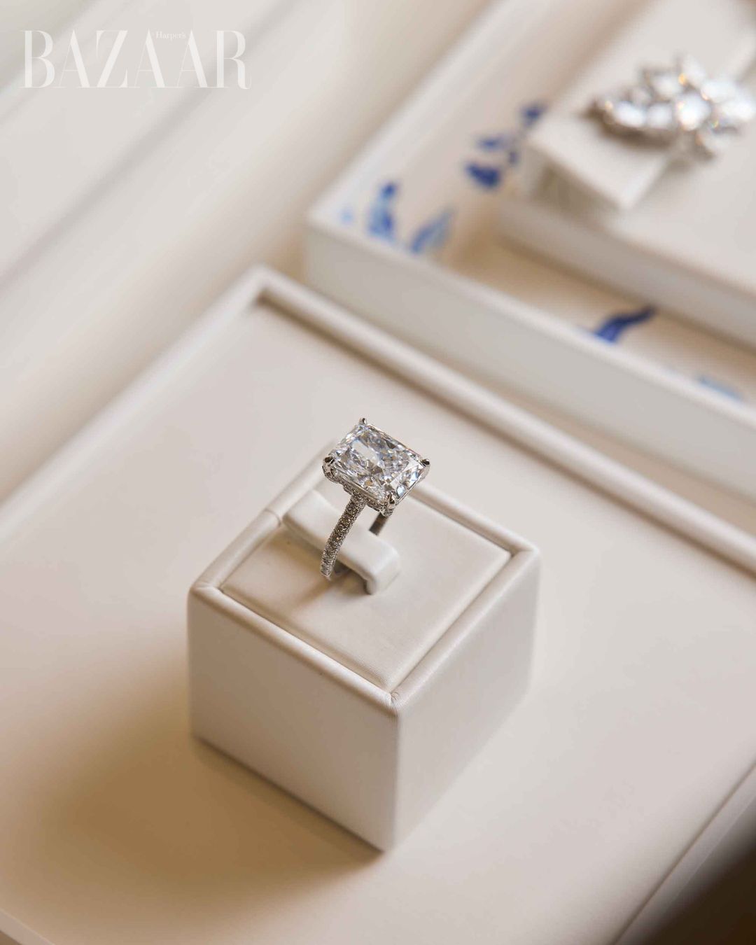 Ánh sáng tinh khiết: Viên kim cương emerald cut hơn 6 carat tỏa sáng rực rỡ trên nền bạch kim, được viền bởi 138 viên kim cương tròn.