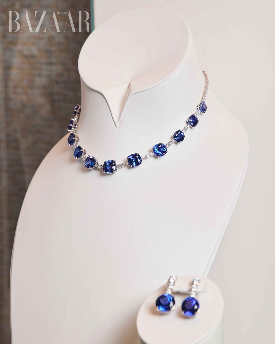 Tiffany & Co. mang đến thiết kế mặt dây chuyền Tanzanite bản lớn, đặt viên đá dạng cushion cut giữa nền vàng trắng và bao viền kim cương baguette, tạo nên hiệu ứng ánh sáng sâu thẳm như một khối tinh thể phát quang. Đây là lựa chọn dành cho những ai yêu thích sự khác biệt, cá tính nhưng vẫn giữ yếu tố thanh lịch.