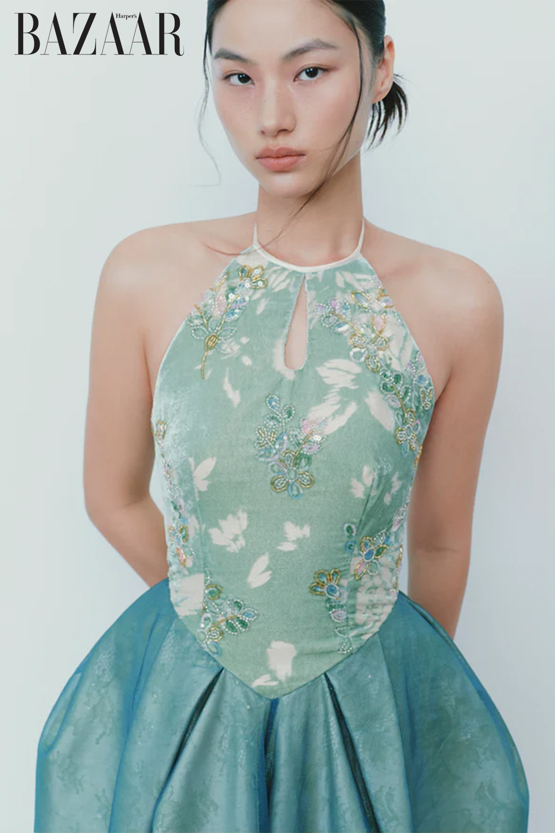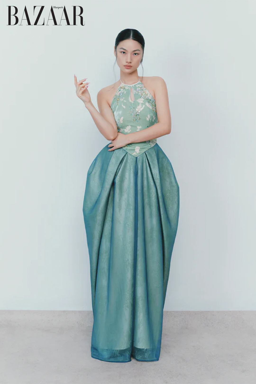 Thiết kế Halter Neck Dress có xuất phát điểm là áo cổ yếm quen thuộc trong trang phục truyền thống Á Đông. Chiếc áo yếm đơn giản được cách tân thành váy liền thân, khi kết hợp với chân váy phồng tạo cảm giác xinh xắn như một đóa hoa đang hé nở. Chất liệu nhung đính kết cườm mang lại vẻ sang trọng cho một thiết kế vốn bắt nguồn từ nội y.