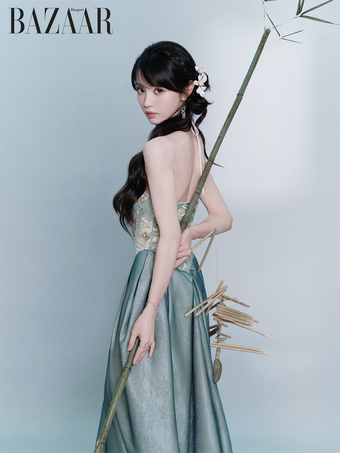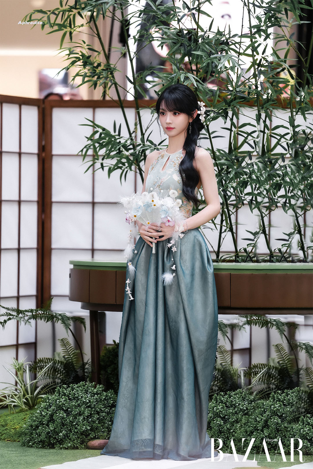Trái ngược với Trần Đô Linh, Điền Hi Vi tham dự một sự kiện ở Hàng Châu với phiên bản xanh ngọc từ DD Atelier by DINGDANG. Phần thân trên với áo cổ yếm cho phép nữ diễn viên khoe trọn tấm lưng và bờ vai săn chắc từ chuỗi ngày tháng tập luyện thể thao ở cường độ cao. Trong bộ ảnh, Điền Hi Vi thậm chí cầm theo thân cây trúc, cho thấy cá tính khẳng khái của bản thân, lẫn tương đồng với nhân vật nữ chính Phàn Trường Ngọc trong phim Trục Ngọc mà cô thủ vai.