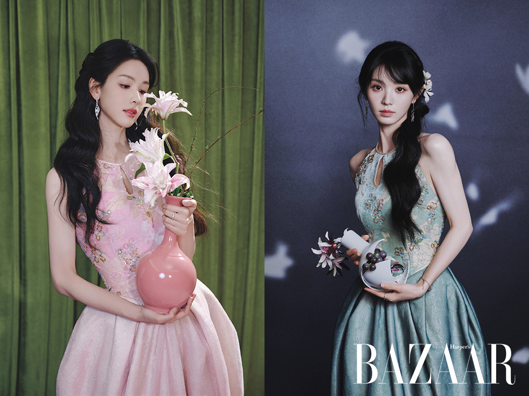 Trần Đô Linh đã chọn phiên bản màu hồng, trong khi Điền Hi Vi mặc thiết kế màu xanh (như trên). Bởi thiết kế đã đủ cầu kỳ, cả hai không thay đổi cấu trúc của trang phục. Tuy nhiên, cách họ phối hợp cùng kiểu tóc, phụ kiện và trang sức mang đến cảm giác rất khác nhau.