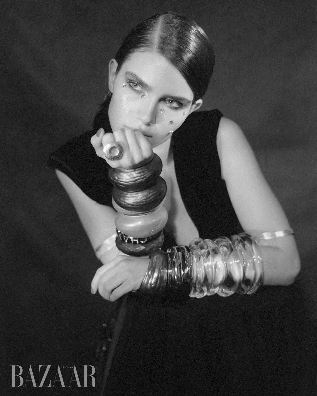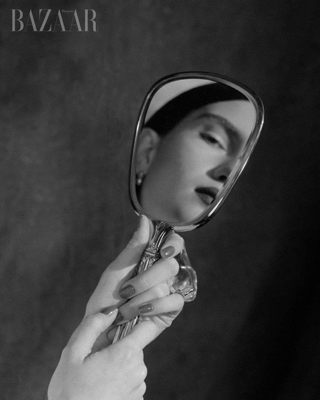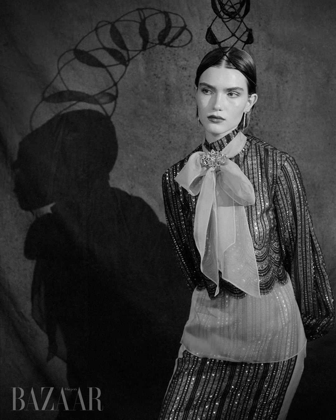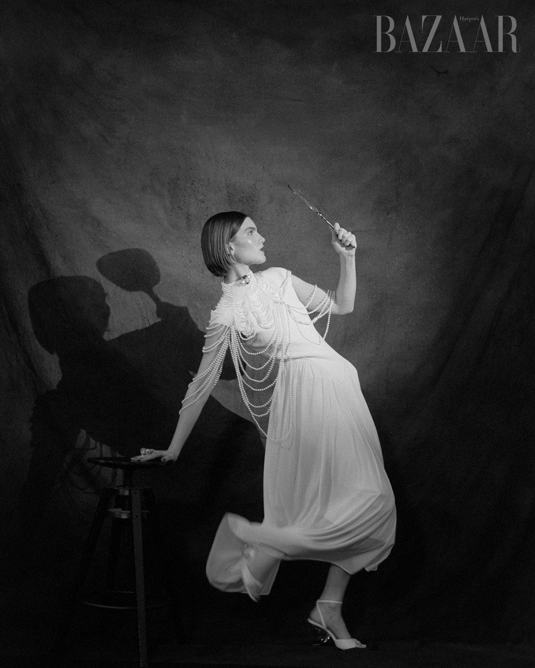 Cô gái tự ngắm mình trong gương, và tưởng tượng mình lọt vào cỗ máy thời gian, đi ngược về thời kỳ 1930 xa hoa. Ở đó, cô khoác lên mình những mẫu trang phục lộng lẫy. Đó là câu chuyện mô tả trong bộ ảnh Glamour Escapism (tạm dịch: Trốn vào thế giới xưa lộng lẫy) Váy satin ôm nhẹ cùng khăn nơ dài. Ngọc trai nhiều tầng và trang sức bản lớn theo phong cách Art Deco – sang trọng, sắc lạnh, mà đầy mê hoặc. Son môi đậm, tóc rẽ ngôi bóng mượt, giày quai mảnh – tất cả đều gợi nhớ đến vẻ hào nhoáng của những ngày xưa cũ.