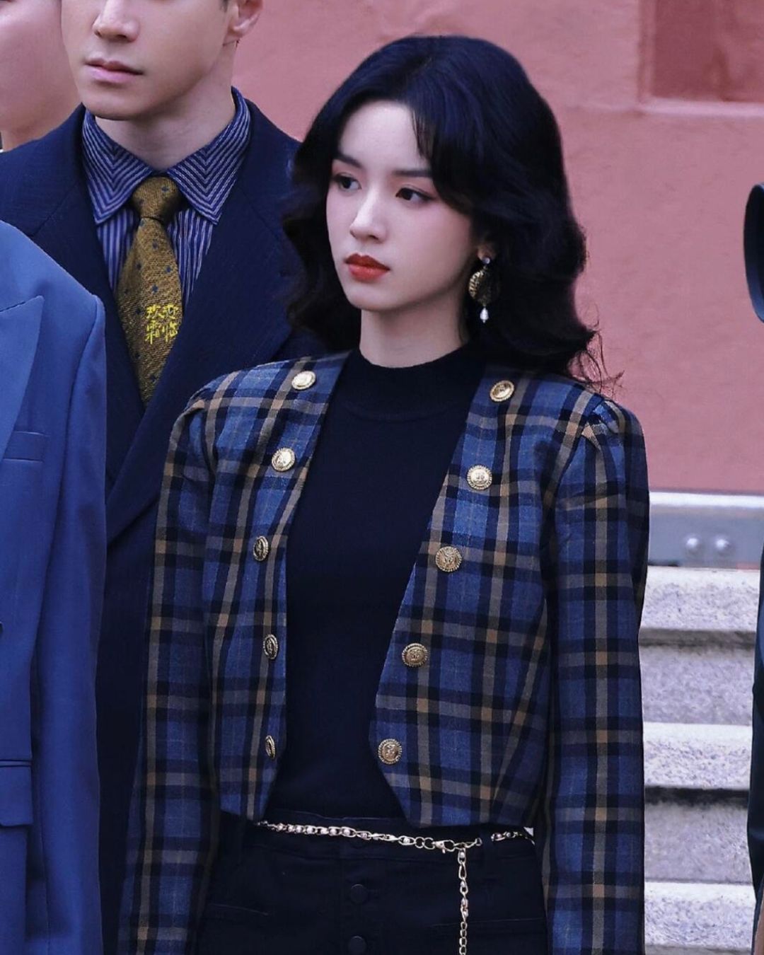 Họa tiết kẻ caro vốn rất thịnh hành thời đó và được trưng dụng triệt để. Áo khoác kẻ caro xanh được điểm xuyến cúc vàng, tăng thêm vẻ trọng công và phong cách thời thượng. Kết hợp cùng áo len đen và quần âu đen bên trong, tạo nên vẻ thẳng thớm, gọn gàng. Dây chuyền thắt lưng kim loại và hoa tai vàng lớn là điểm nhấn, với nét phóng khoáng, càng thể hiện vẻ đẹp của thời kỳ kinh tế phát triển.