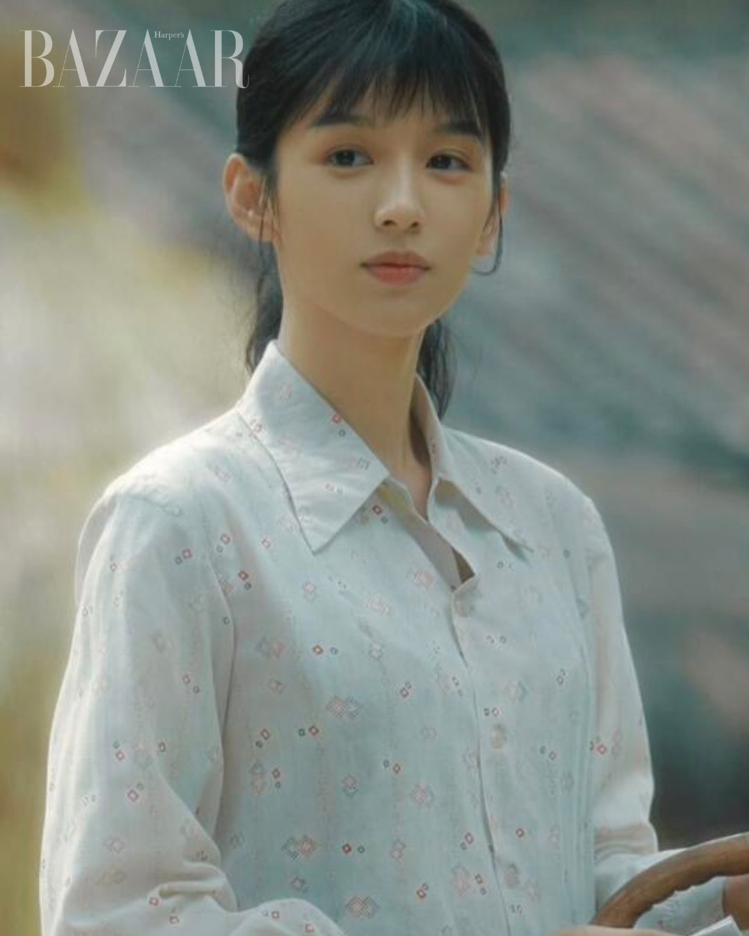 Sơ mi cổ đứng kết hợp ren và tay phồng là thiết kế mang khí phái cổ điển, kết hợp cùng chân váy dài họa tiết hoa, mang lại cảm giác xuân sắc. Thắt lưng bản to giúp tôn lên tỷ lệ eo và hông. Họa tiết chấm bi cũng góp phần tạo nên phong cách hoài cổ đậm chất Hồng Kông.