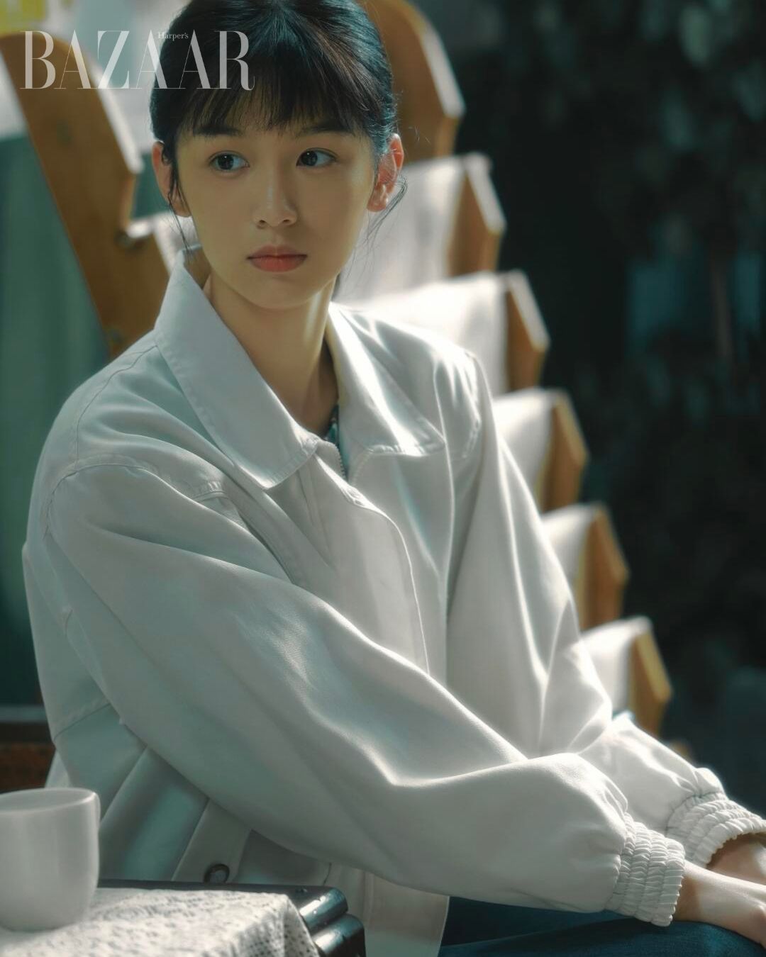 Áo khoác trắng đơn giản lịch sự, kết hợp cùng quần jeans cơ bản, tiện lợi và thoải mái. Cùng với kiểu tóc đuôi ngựa cao mái bằng của Hạ Hiểu Lan mang lại cho người xem một cảm giác thật sạch sẽ và thuần khiết.