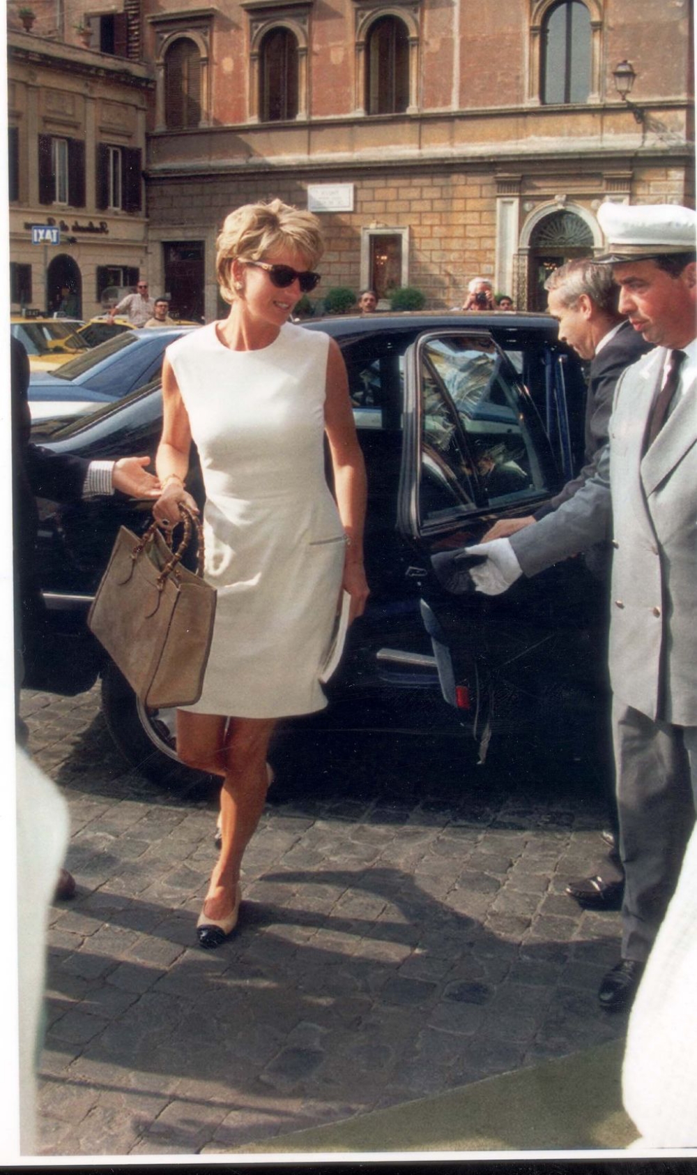 Hình ảnh công nương Diana bên chiếc túi Gucci tay cầm bằng tre sơn mài trong những năm 90. Ảnh: Mike Forster/Daily Mail/Shutterstock.