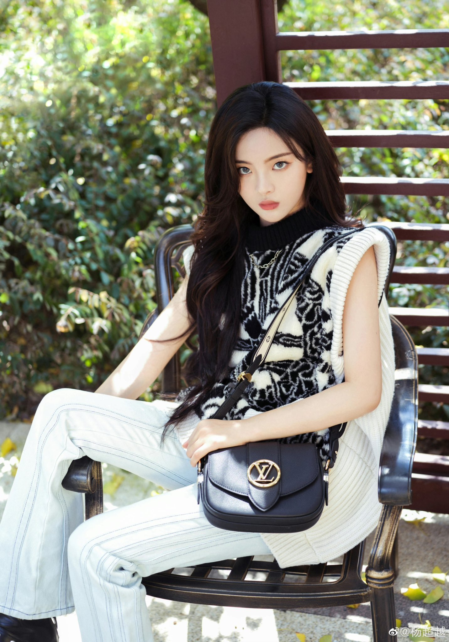 Nữ thần tượng Dương Siêu Việt phối túi xách với áo len dệt kim. Nếu bạn là tuýp thích mặc trang phục có nhiều họa tiết rối mắt, nên chọn một mẫu túi trơn láng, tối giản đi kèm. Những mẫu túi trơn màu như LV Pont 9 Soft là một lựa chọn tốt.