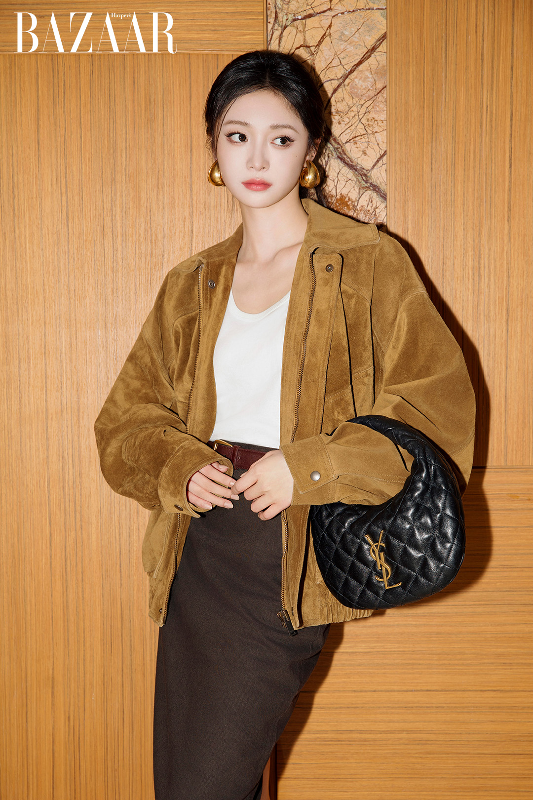Chu Khiết Quỳnh thể hiện gu thời trang trưởng thành nhưng vẫn rất mềm mại. Cô diện áo khoác suede màu nâu caramel với phom dáng rộng và chất liệu mượt như nhung, tạo nên cảm giác ấm áp và cổ điển. Bên trong là áo tank top trắng giúp tổng thể cân bằng và làm nổi bật kết cấu sang trọng của chiếc áo khoác. Chiếc túi xách Saint Laurent Icarino màu đen ton-sur-ton với chân váy đen.