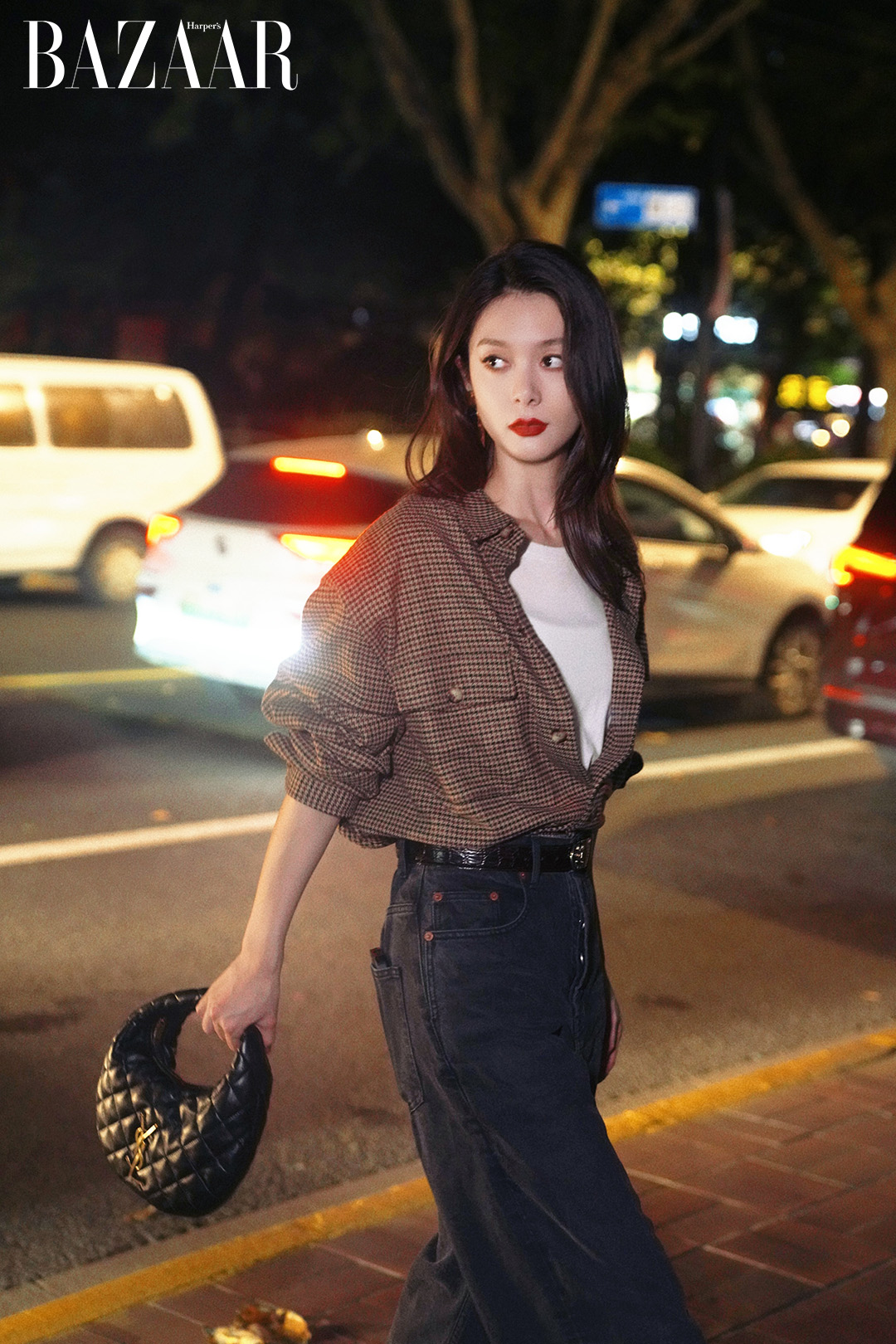 Phó Tinh chọn áo sơ mi kẻ nâu dáng rộng, khoác hờ theo kiểu effortless. Bên trong là áo trắng, một lớp nền tối giản giúp tổng thể trở nên sáng và hài hòa hơn. Cô phối cùng quần jeans ống rộng cạp cao tôn dáng và giúp đôi chân trông dài hơn, đồng thời giữ cho outfit vừa chất vừa mềm mại. Chiếc belt da đen nhỏ nhắn nhưng sắc nét góp phần hoàn thiện bộ cánh. Mái tóc buông nhẹ kết hợp với son đỏ trầm khiến vẻ ngoài thêm phần nổi bật và rất điện ảnh. Một diện mạo năng động chuẩn cho buổi dạo phố cuối tuần.