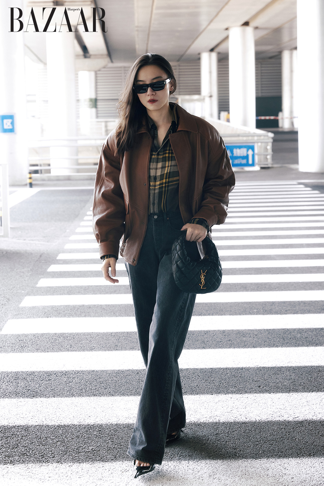 Tống Giai urban chic, như đang sẵn sàng cho cơn gió lạnh mùa thu đông. Chiếc áo khoác da nâu dáng rộng tạo nên vẻ mạnh mẽ và cá tính. Chất liệu da mềm khiến dáng áo đứng form nhưng không hề cứng, giữ được vẻ phóng khoáng tự nhiên. Bên trong, cô diện áo sơ mi kẻ caro tone trầm, phối layer tinh tế để tạo sự hài hòa nhưng vẫn đảm bảo chiều sâu thị giác. Cô kết hợp outfit với quần jeans ống suôn phủ gót để trông cao ráo hơn. Kính râm đen tăng thêm nét bí ẩn, sắc lạnh. Hoàn thiện tổng thể là đôi giày mũi nhọn đen, tạo đường line sắc sảo cho dáng đứng lẫn dáng đi, đồng thời bổ sung nét thanh lịch cho toàn set đồ.