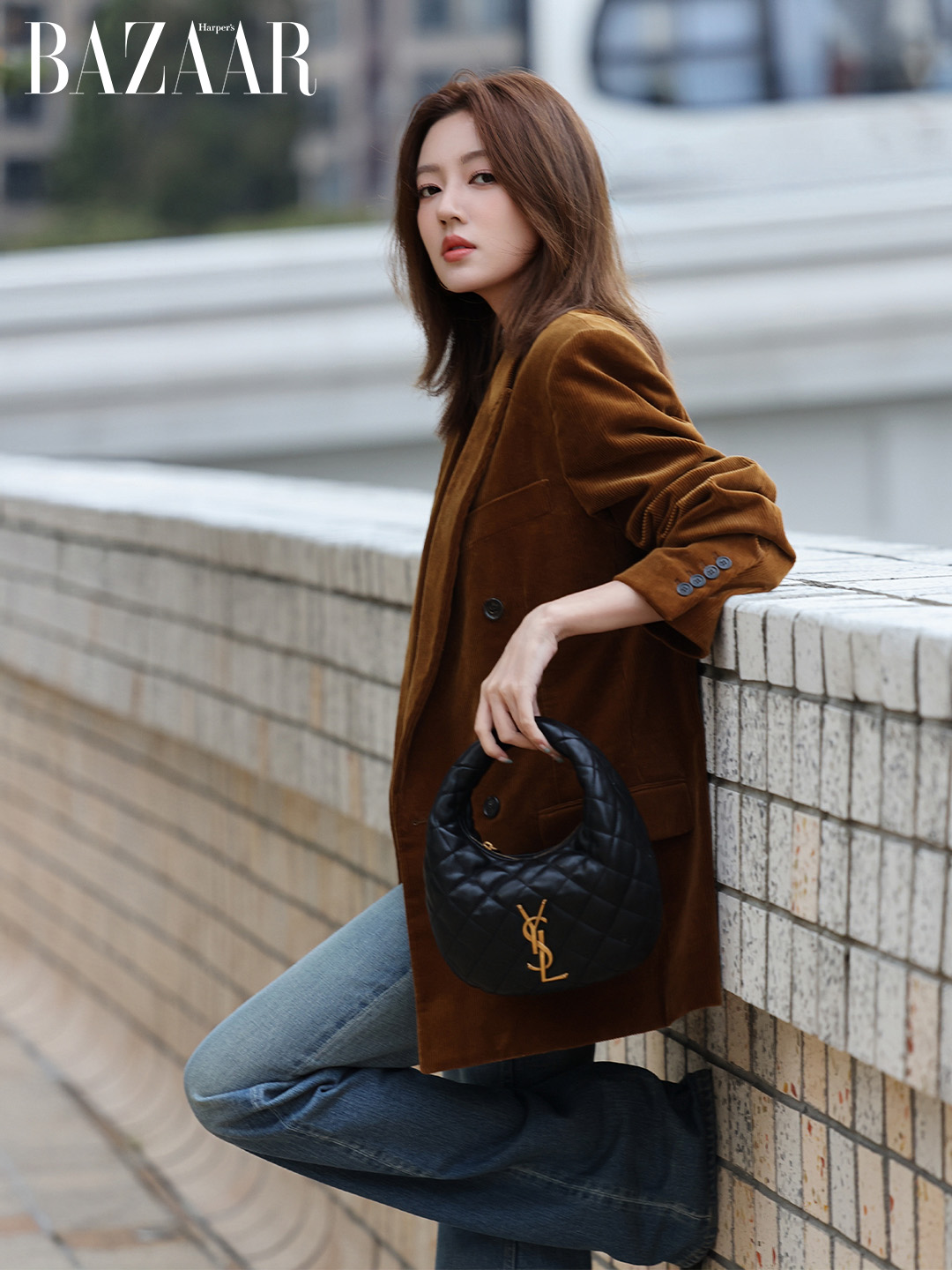 Hà Thụy Hiền mang phong cách street chic mà bất kỳ nàng công sở nào cũng có thể áp dụng được. Chiếc blazer nhung màu nâu đất mang hơi thở vintage, dáng oversize vừa đủ để tạo sự sang trọng. Nữ diễn viên kết hợp cùng quần jeans xanh dáng suôn ống bát đậm chất retro. Kiểu tóc xoã tự nhiên, lớp makeup nhẹ nhàng nhưng sắc nét càng tôn lên khí chất tinh tế, có chút “cool girl” đầy kiêu kỳ.