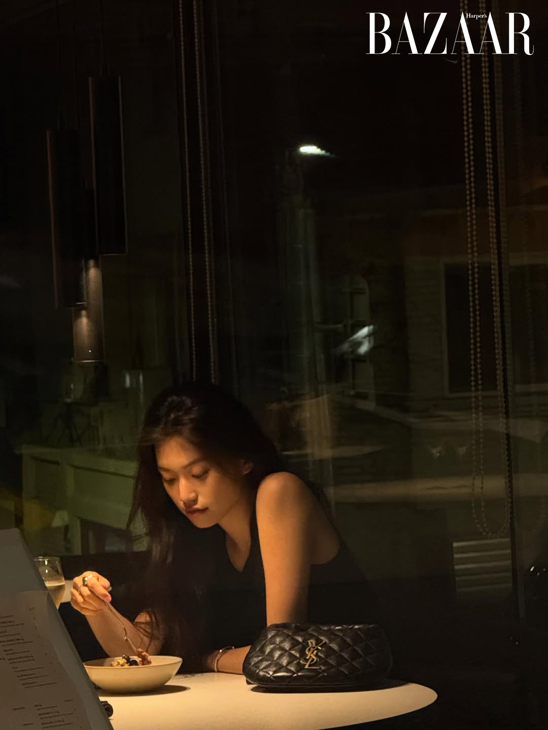 Kim Do Yeon chọn cho mình chiếc túi xách Saint Laurent Icarino trong buổi đi ăn thoải mái. Cô diện tank top ôm sát màu đen, kết hợp với quần jeans dáng suôn xanh nhạt, đậm nét effortless chic như những cô gái nước Pháp. Đôi boots mũi nhọn màu đen giúp tổng thể trở nên sắc nét hơn.